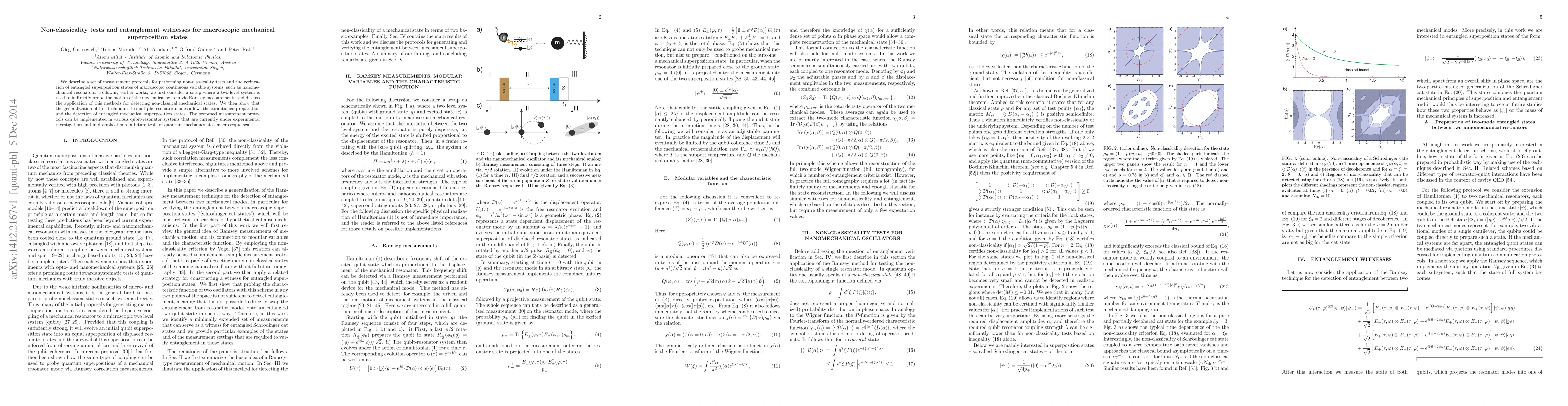 We describe a set of measurement protocols for performing non-classicality tests and the verification of entangled superposition states of macroscopic continuous variable systems, such as nanomechanical resonators. Following earlier works, we first consider a setup where a two-level system is used to indirectly probe the motion of the mechanical system via Ramsey measurements and discuss the application of this methods for detecting non-classical mechanical states. We then show that the generalization of this techniques to multiple resonator modes allows the conditioned preparation and the detection of entangled mechanical superposition states. The proposed measurement protocols can be implemented in various qubit-resonator systems that are currently under experimental investigation and find applications in future tests of quantum mechanics at a macroscopic scale.