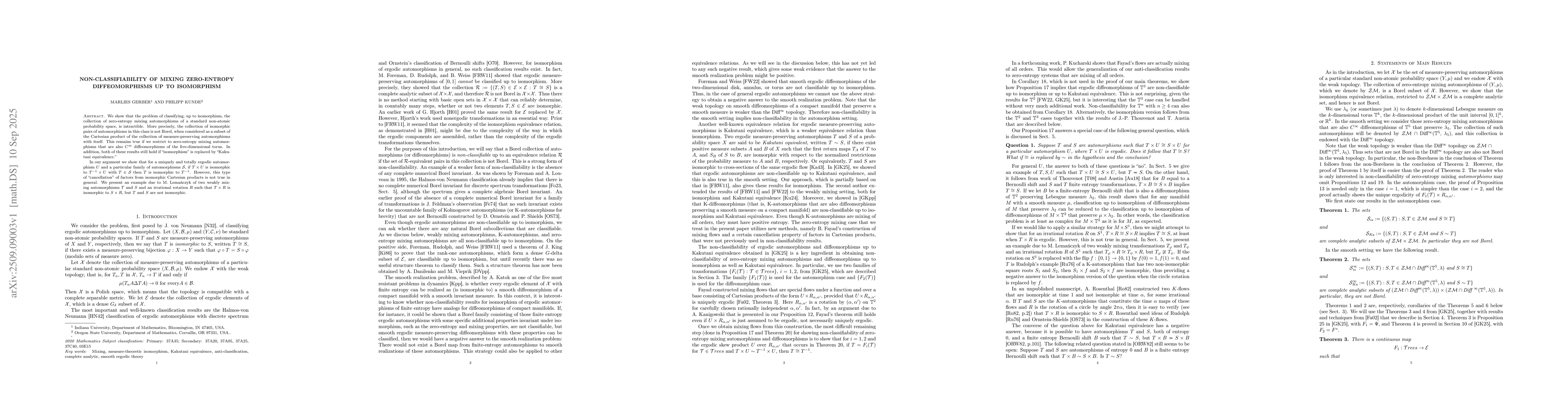 We show that the problem of classifying, up to isomorphism, the collection of zero-entropy mixing automorphisms of a standard non-atomic probability space, is intractible. More precisely, the collection of isomorphic pairs of automorphisms in this class is not Borel, when considered as a subset of the Cartesian product of the collection of measure-preserving automorphisms with itself. This remains true if we restrict to zero-entropy mixing automorphisms that are also $C^{\infty}$ diffeomorphisms of the five-dimensional torus. In addition, both of these results still hold if ``isomorphism'' is replaced by ``Kakutani equivalence.'' In our argument we show that for a uniquely and totally ergodic automorphism $U$ and a particular family of automorphisms $\mathcal{S}$, if $T\times U$ is isomorphic to $T^{-1}\times U$ with $T\in\mathcal{S}$ then $T$ is isomorphic to ${T^{-1}}$. However, this type of ``cancellation'' of factors from isomorphic Cartesian products is not true in general. We present an example due to M. Lema\'nczyk of two weakly mixing automorphisms $T$ and $S$ and an irrational rotation $R$ such that $T\times R$ is isomorphic to $S\times R$, but $T$ and $S$ are not isomorphic.