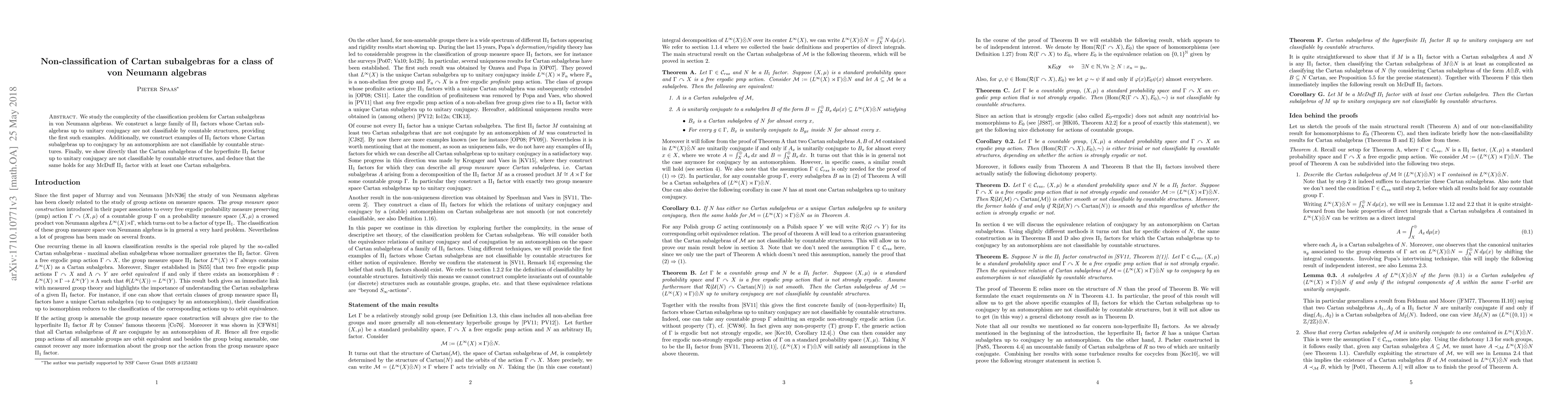 This paper investigates the classification complexity of Cartan subalgebras in von Neumann algebras, demonstrating that certain II$_1$ factors' Cartan subalgebras cannot be classified by countable structures. It constructs examples of such non-classifiable Cartan subalgebras in both unitary and automorphism conjugacy contexts.