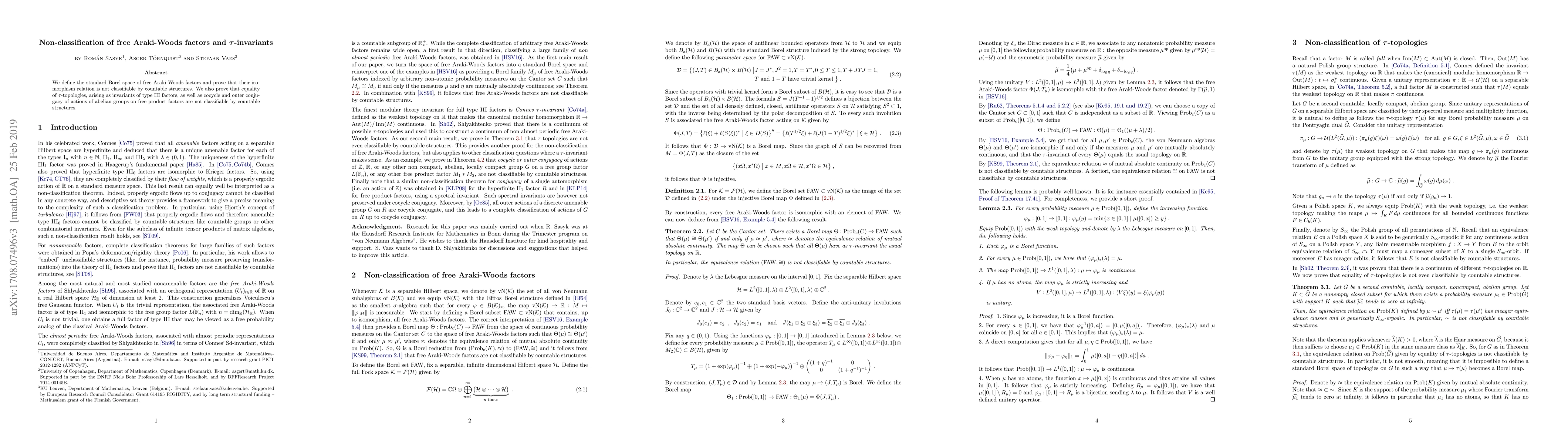 We define the standard Borel space of free Araki-Woods factors and prove that their isomorphism relation is not classifiable by countable structures. We also prove that equality of $\tau$-topologies, arising as invariants of type III factors, as well as coycle and outer conjugacy of actions of abelian groups on free product factors are not classifiable by countable structures.