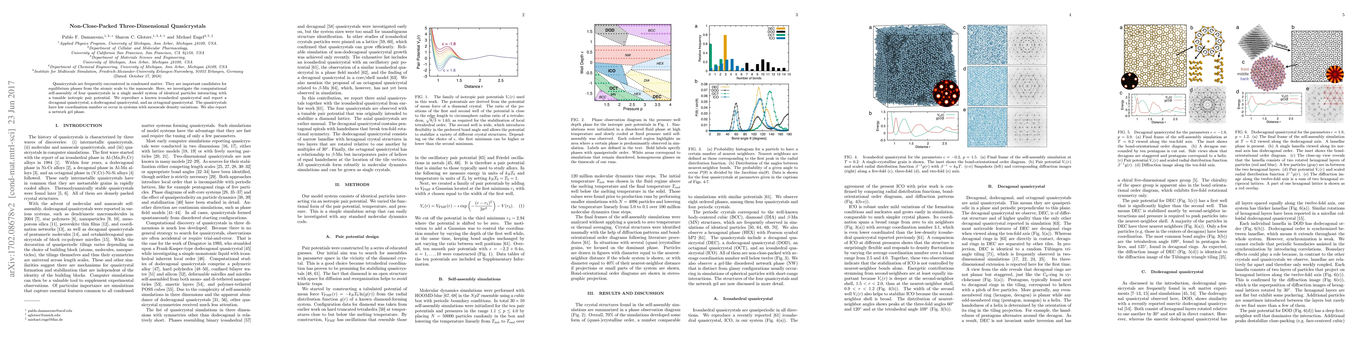 This study computationally explores the self-assembly of four non-close-packed three-dimensional quasicrystals using identical particles with a tunable pair potential, revealing icosahedral, decagonal, dodecagonal, and octagonal quasicrystals, alongside a network gel phase. These quasicrystals exhibit low coordination numbers and occur in systems with density variations.