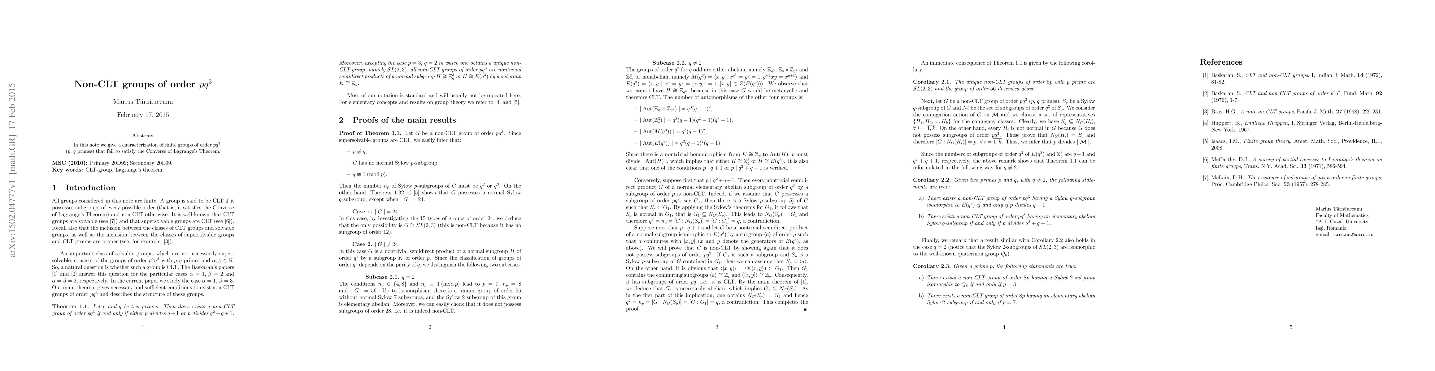 In this note we give a characterization of finite groups of order $pq^3$ ($p$, $q$ primes) that fail to satisfy the Converse of Lagrange's Theorem.