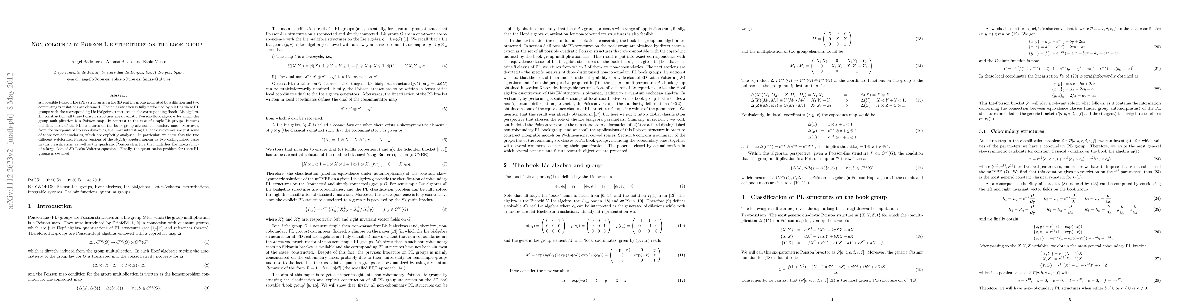 All possible Poisson-Lie (PL) structures on the 3D real Lie group generated by a dilation and two commuting translations are obtained. Its classification is fully performed by relating these PL groups with the corresponding Lie bialgebra structures on the corresponding "book" Lie algebra. By construction, all these Poisson structures are quadratic Poisson-Hopf algebras for which the group multiplication is a Poisson map. In contrast to the case of simple Lie groups, it turns out that most of the PL structures on the book group are non-coboundary ones. Moreover, from the viewpoint of Poisson dynamics, the most interesting PL book structures are just some of these non-coboundaries, which are explicitly analysed. In particular, we show that the two different q-deformed Poisson versions of the sl(2,R) algebra appear as two distinguished cases in this classification, as well as the quadratic Poisson structure that underlies the integrability of a large class of 3D Lotka-Volterra equations. Finally, the quantization problem for these PL groups is sketched.