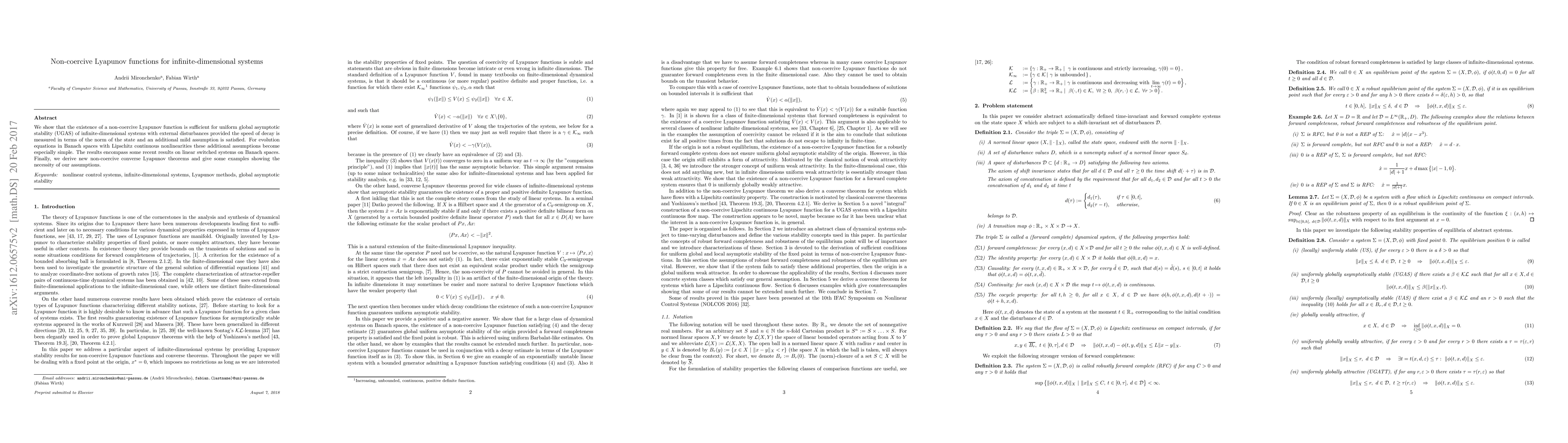 This paper demonstrates that non-coercive Lyapunov functions can ensure uniform global asymptotic stability for infinite-dimensional systems with disturbances, provided the decay rate is measured by the state norm and a mild assumption holds. It also introduces new converse Lyapunov theorems and examples illustrating the necessity of these assumptions.