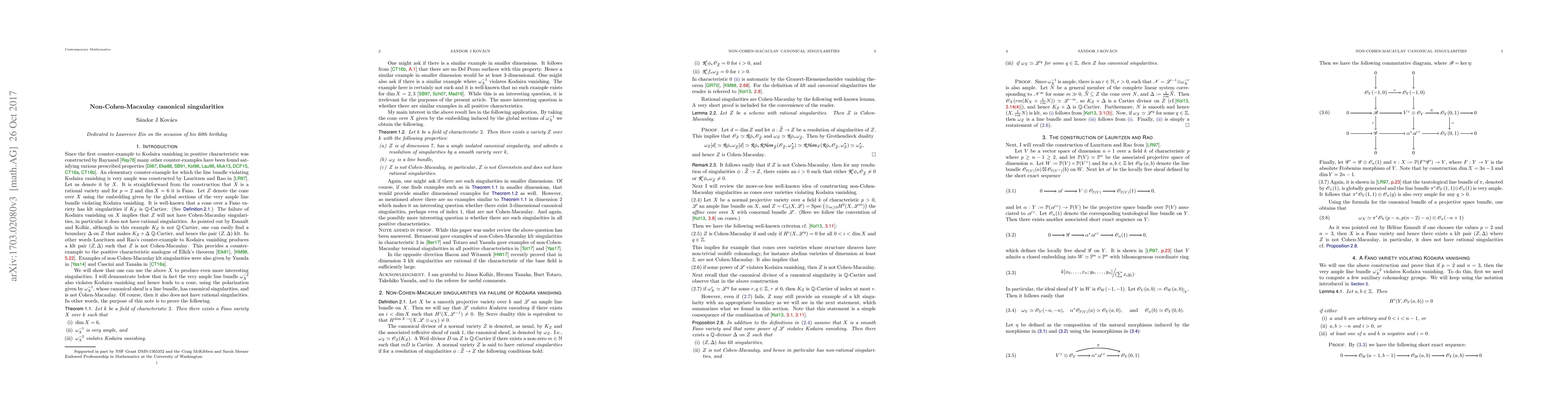 Summary: The paper demonstrates the existence of a smooth Fano variety in characteristic two where the square of the anti-canonical bundle does not adhere to Kodaira vanishing, leading to the construction of non-Cohen-Macaulay canonical singularities in this characteristic.