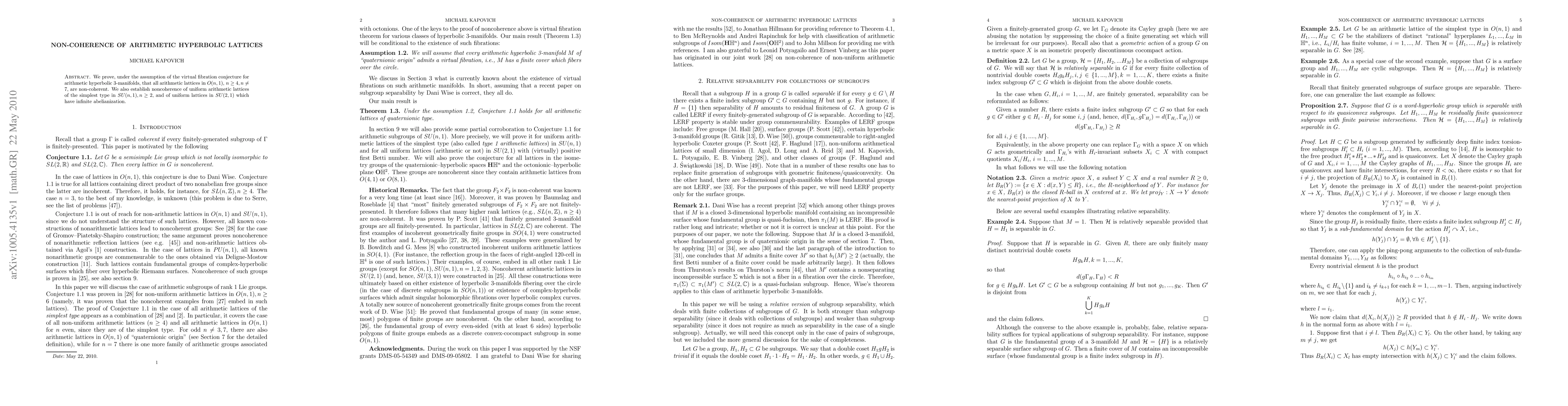 This paper proves the non-coherence of arithmetic hyperbolic lattices in O(n,1) for n>4, excluding n=7, and also for uniform arithmetic lattices in SU(n,1) for n>1 and in SU(2,1) with infinite abelianization, under the virtual fibration conjecture for arithmetic hyperbolic 3-manifolds.