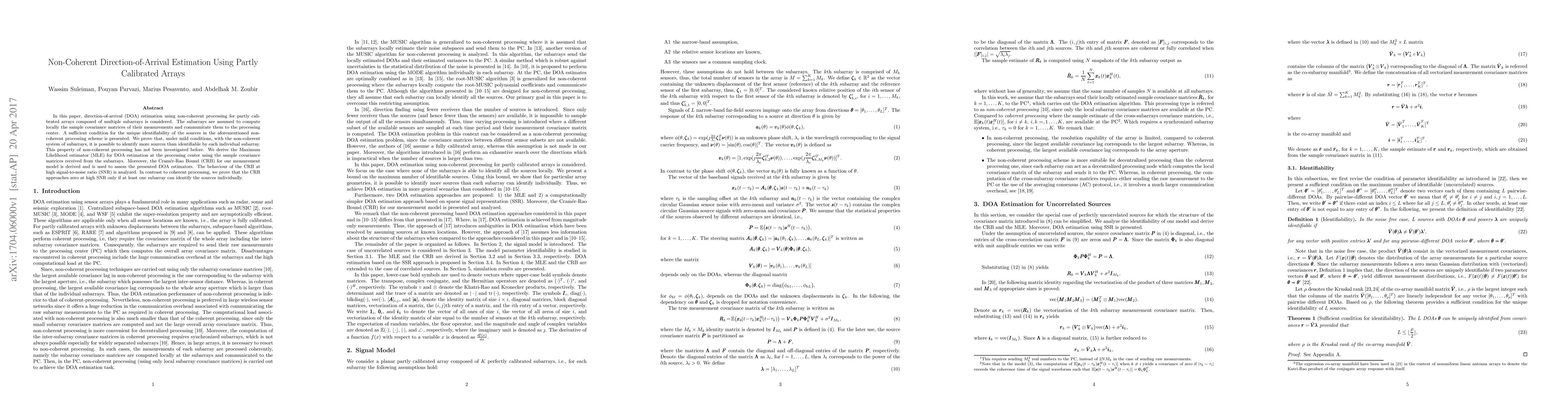This paper explores non-coherent direction-of-arrival (DOA) estimation for partly calibrated arrays, demonstrating that the combined subarrays can identify more sources than any single subarray. It presents a Maximum Likelihood estimator and derives the Cramer-Rao Bound, showing that high SNR conditions allow for improved source identification.