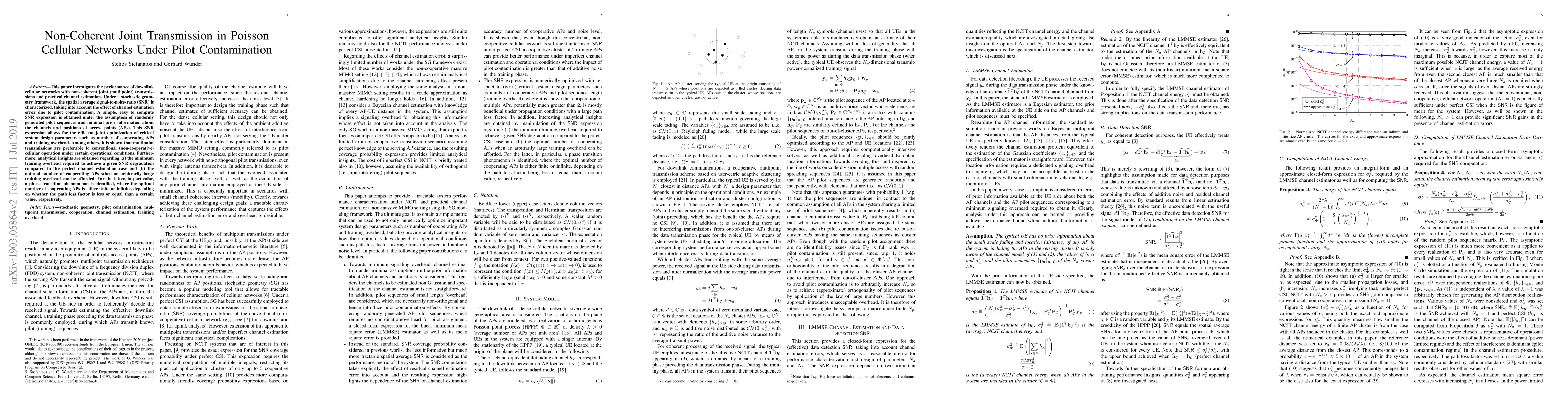 This paper evaluates the performance of non-coherent joint transmissions in Poisson cellular networks, considering pilot contamination and channel estimation errors. It derives a simple SNR expression that facilitates optimization of system design parameters, showing that multipoint transmissions can outperform conventional cellular operations under specific conditions.