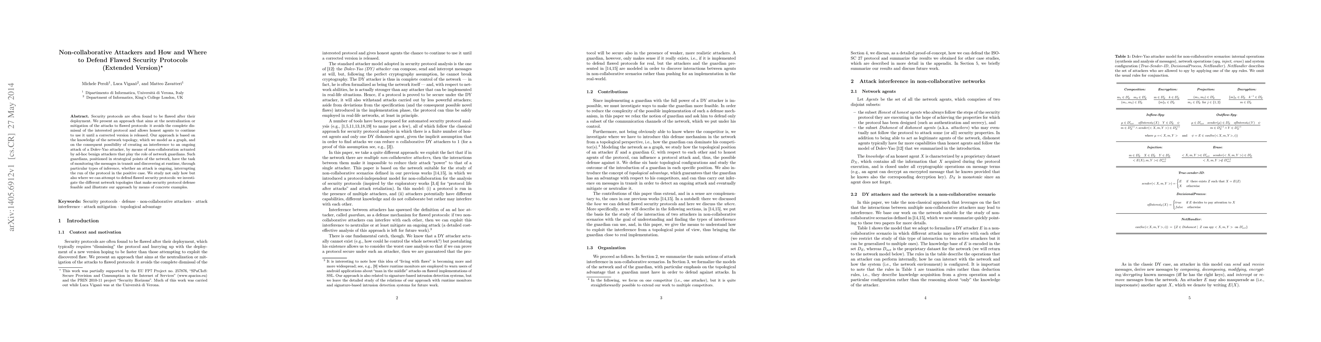 Security protocols are often found to be flawed after their deployment. We present an approach that aims at the neutralization or mitigation of the attacks to flawed protocols: it avoids the complete dismissal of the interested protocol and allows honest agents to continue to use it until a corrected version is released. Our approach is based on the knowledge of the network topology, which we model as a graph, and on the consequent possibility of creating an interference to an ongoing attack of a Dolev-Yao attacker, by means of non-collaboration actuated by ad-hoc benign attackers that play the role of network guardians. Such guardians, positioned in strategical points of the network, have the task of monitoring the messages in transit and discovering at runtime, through particular types of inference, whether an attack is ongoing, interrupting the run of the protocol in the positive case. We study not only how but also where we can attempt to defend flawed security protocols: we investigate the different network topologies that make security protocol defense feasible and illustrate our approach by means of concrete examples.