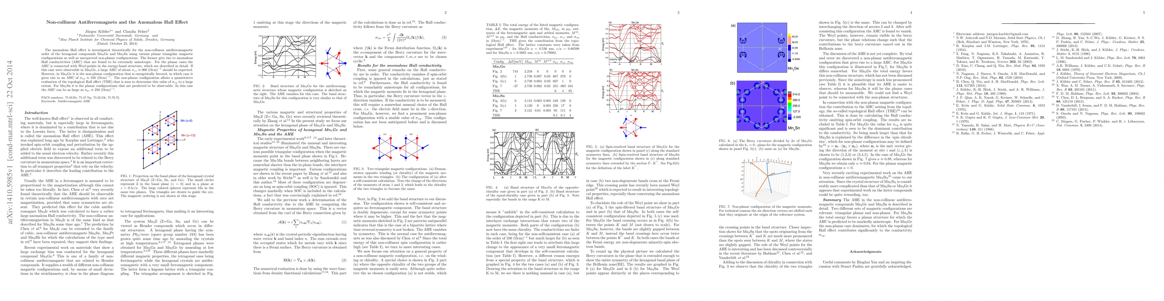 The anomalous Hall effect is investigated theoretically by means of density functional calculations for the non-collinear antiferromagnetic order of the hexagonal compounds Mn$_3$Ge and Mn$_3$Sn using various planar triangular magnetic configurations as well as unexpected non-planar configurations. The former give rise to anomalous Hall conductivities (AHC) that are found to be extremely anisotropic. For the planar cases the AHC is connected with Weyl-points in the energy-band structure, which are described in detail. If this case were observable in Mn$_3$Ge, a large AHC of about 900 S/cm should be expected. However, in Mn$_3$Ge it is the non-planar configuration that is energetically favored, in which case it gives rise to an AHC of 100 S/cm. The non-planar configuration allows a quantitative evaluation of the topological Hall effect that is seen to determine this value of the conductivity to a large extent. For Mn$_3$Sn it is the planar configurations that are predicted to be observable. In this case the AHC can be as large as 250 S/cm.