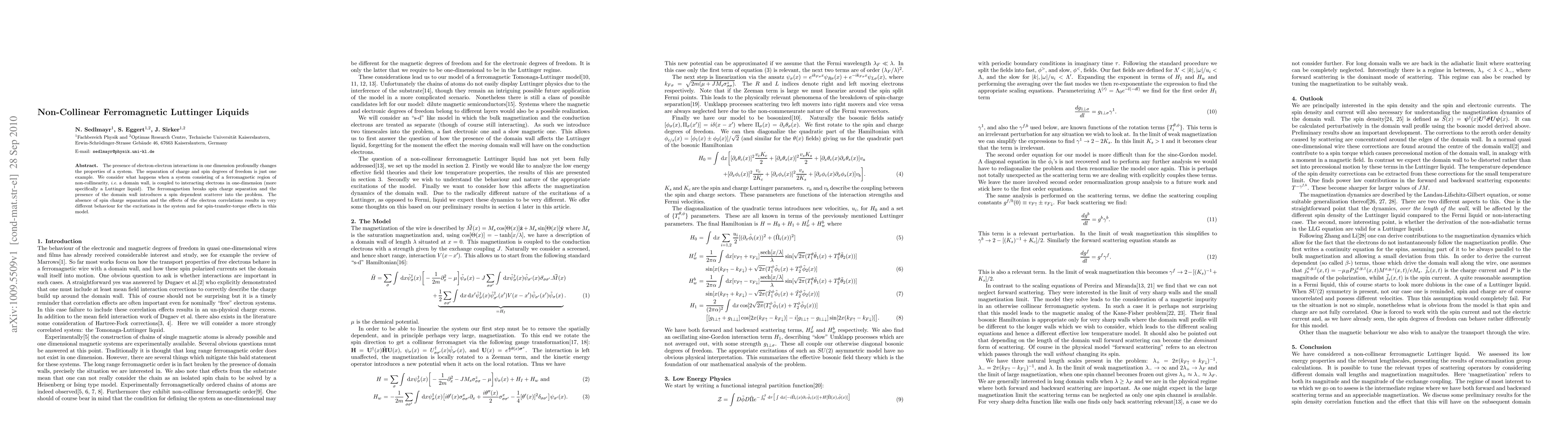This paper investigates the unique properties of a one-dimensional Luttinger liquid with electron-electron interactions when coupled to a ferromagnetic region featuring non-collinear spin alignment, specifically a domain wall. The study reveals that the ferromagnetism disrupts the usual spin-charge separation and leads to distinct excitation behaviors and spin-transfer-torque effects.