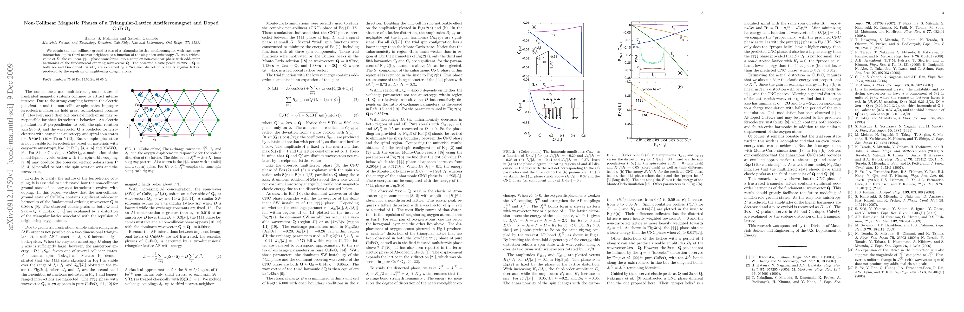 Summary: This study explores non-collinear magnetic phases in a triangular-lattice antiferromagnet, revealing a transition from a collinear to a complex non-collinear phase at a critical anisotropy value. The observed elastic peaks in doped CuFeO$_2$ are attributed to lattice distortions caused by oxygen atom repulsion.