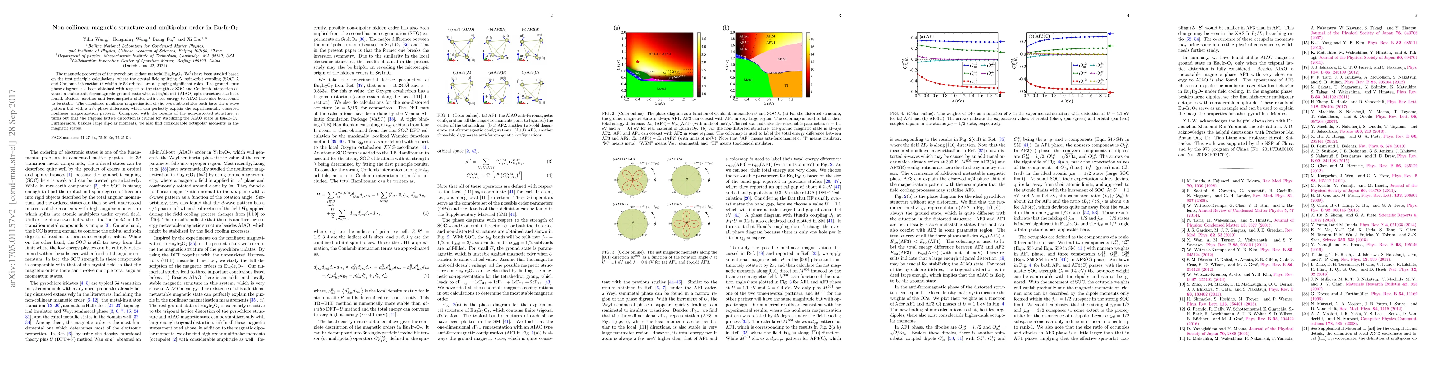 The magnetic properties of the pyrochlore iridate material Eu$_2$Ir$_2$O$_7$ (5$d^5$) have been studied based on the first principle calculations, where the crystal field splitting $\Delta$, spin-orbit coupling (SOC) $\lambda$ and Coulomb interaction $U$ within Ir 5$d$ orbitals are all playing significant roles. The ground state phase diagram has been obtained with respect to the strength of SOC and Coulomb interaction $U$, where a stable anti-ferromagnetic ground state with all-in/all-out (AIAO) spin structure has been found. Besides, another anti-ferromagnetic states with close energy to AIAO have also been found to be stable. The calculated nonlinear magnetization of the two stable states both have the d-wave pattern but with a $\pi/4$ phase difference, which can perfectly explain the experimentally observed nonlinear magnetization pattern. Compared with the results of the non-distorted structure, it turns out that the trigonal lattice distortion is crucial for stabilizing the AIAO state in Eu$_2$Ir$_2$O$_7$. Furthermore, besides large dipolar moments, we also find considerable octupolar moments in the magnetic states.