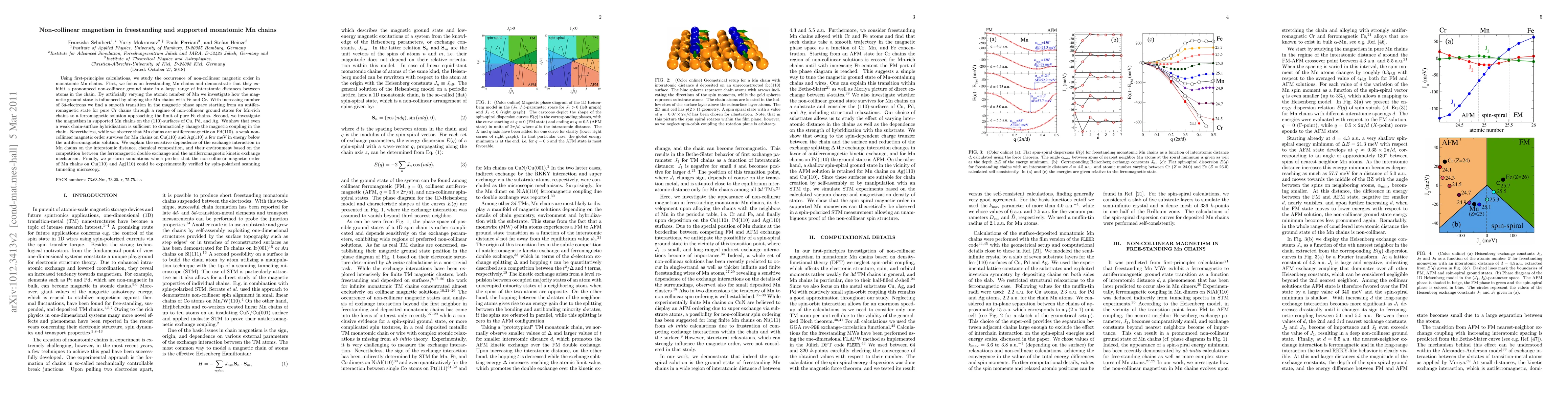 This research investigates non-collinear magnetism in monatomic Mn chains using first-principles calculations, revealing a pronounced non-collinear ground state in freestanding chains and a transition in magnetic order influenced by alloying with Fe and Cr. Supported Mn chains on Cu, Pd, and Ag surfaces show altered magnetic coupling, with Mn chains on Cu(110) and Ag(110) maintaining a weak non-collinear order.