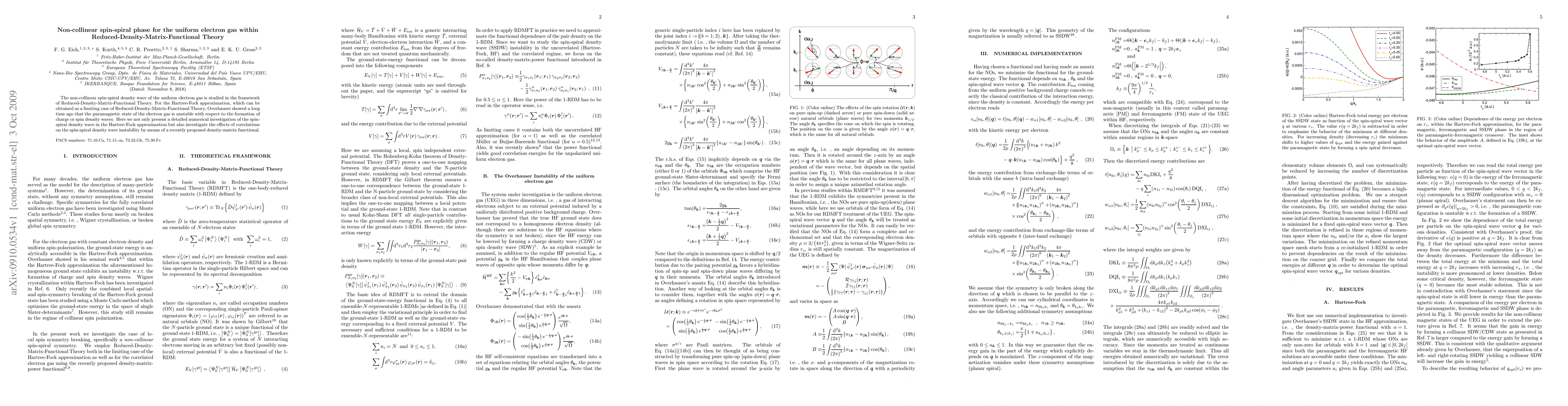 This research investigates the non-collinear spin-spiral density wave in the uniform electron gas using Reduced-Density-Matrix-Functional Theory, providing a detailed numerical study in the Hartree-Fock approximation and examining the impact of electron correlations on the instability of the spin-spiral phase.