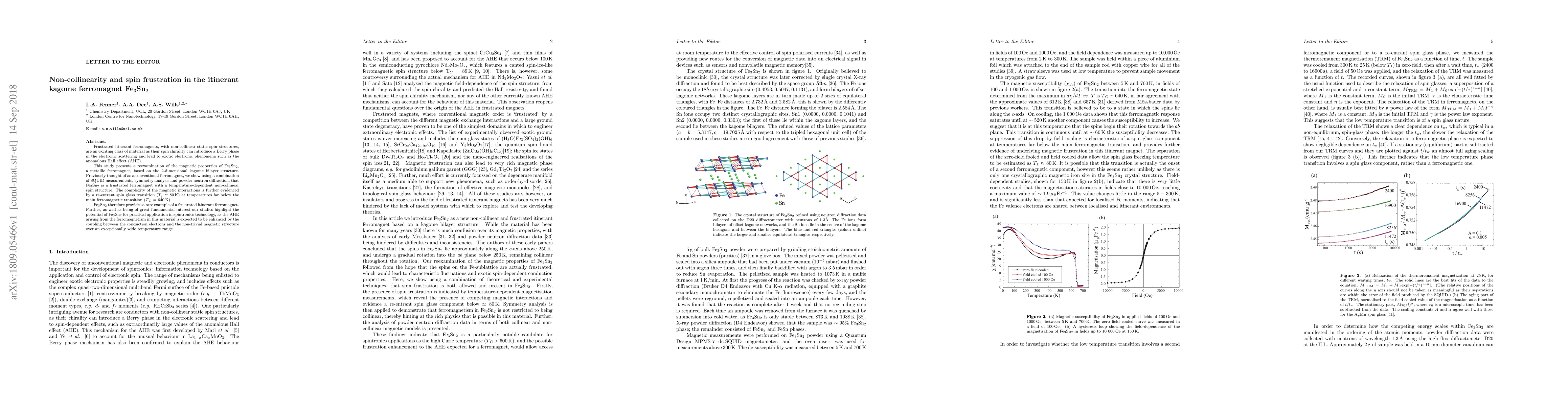 This study reveals that Fe$_3$Sn$_2$ is a frustrated itinerant ferromagnet with a non-collinear spin structure, potentially leading to an enhanced anomalous Hall effect over a wide temperature range, thus promising applications in spintronics. The complex magnetic interactions in Fe$_3$Sn$_2$ are evidenced by a re-entrant spin glass transition below its main ferromagnetic transition.