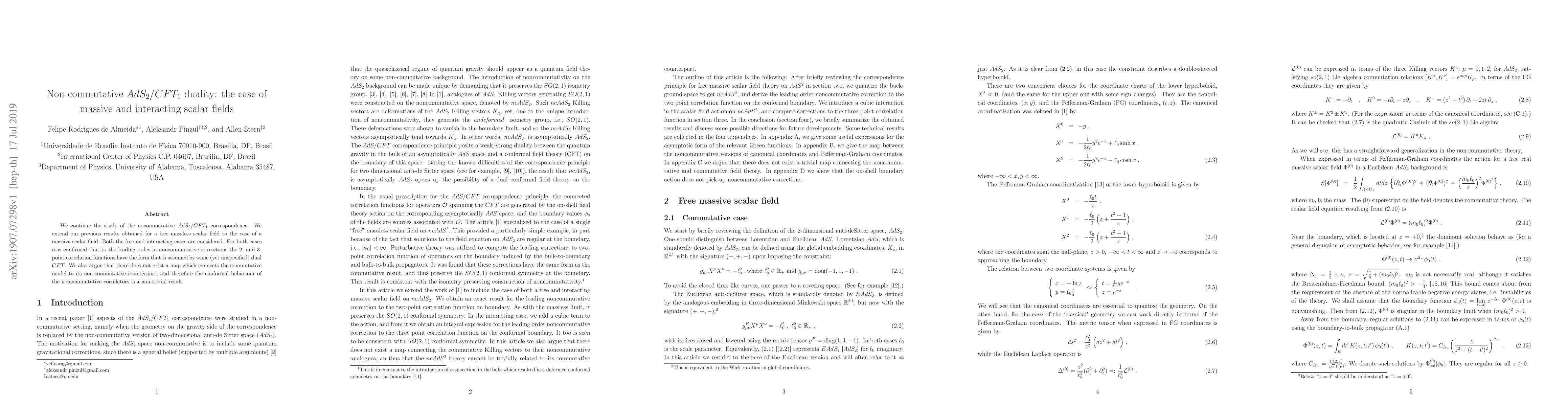 This paper extends the non-commutative $AdS_2/CFT_1$ duality to massive scalar fields, confirming that 2- and 3-point correlation functions maintain the assumed form of the dual $CFT$ at leading order in noncommutative corrections. It concludes that no map exists between commutative and non-commutative models, highlighting the non-trivial nature of conformal behavior in noncommutative correlators.