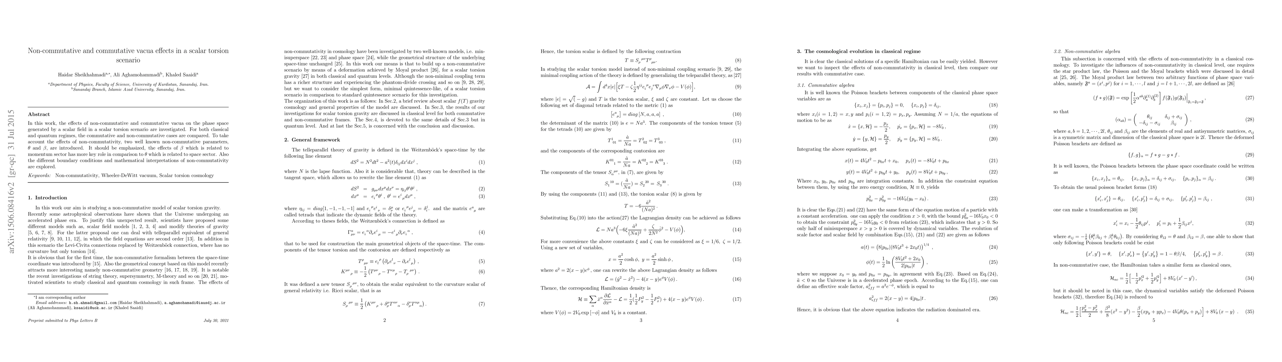 This paper investigates how non-commutative and commutative vacua affect phase space in a scalar torsion scenario, comparing classical and quantum regimes, with implications for momentum and space sectors.