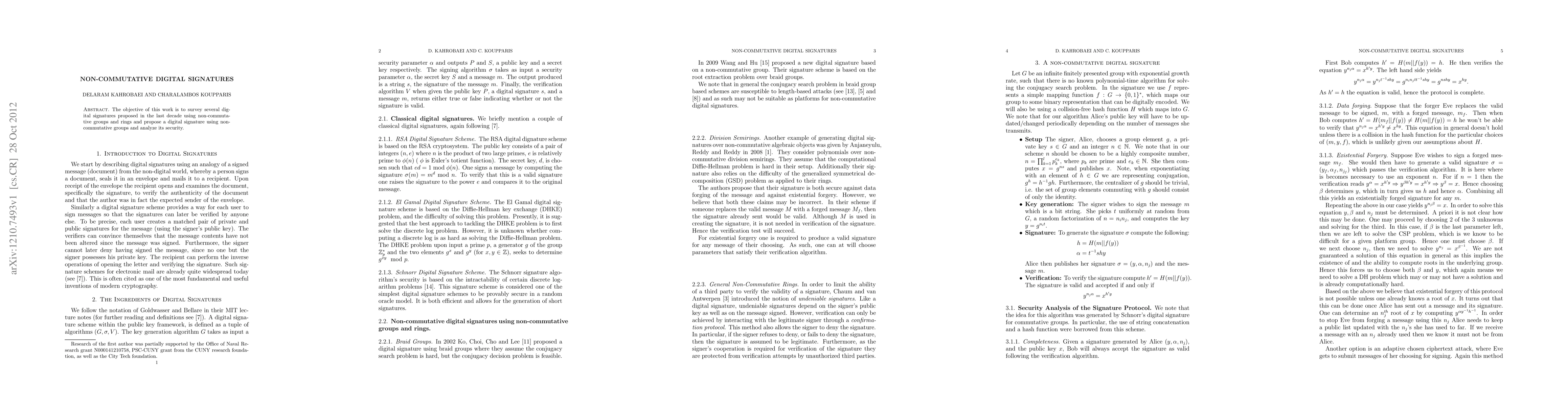 The objective of this work is to survey several digital signatures proposed in the last decade using non-commutative groups and rings and propose a digital signature using non-commutative groups and analyze its security.