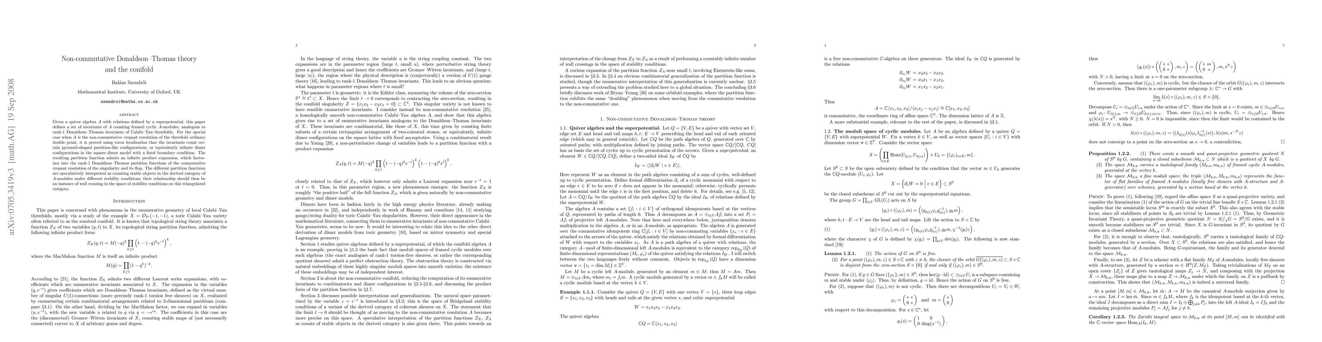 This paper introduces invariants for a non-commutative Donaldson-Thomas theory, counting framed cyclic modules over a quiver algebra, and demonstrates their application to the conifold's non-commutative crepant resolution. The invariants are shown to correspond to infinite dimer configurations, factorizing into the rank-1 Donaldson-Thomas partition functions of the commutative crepant resolution and its flop.