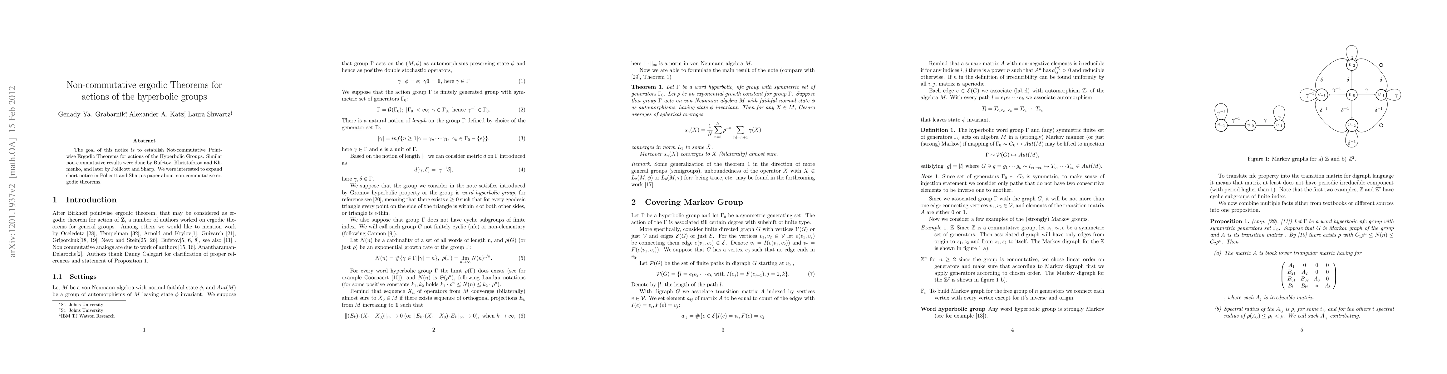 The goal of this notice is to establish Not-commutative Point- wise Ergodic Theorems for actions of the Hyperbolic Groups. Similar non-commutative results were done by Bufetov, Khristoforov and Kli- menko, and later by Pollicott and Sharp. We were interested to expand short notice in Policott and Sharp's paper about non-commutative er- godic theorems.