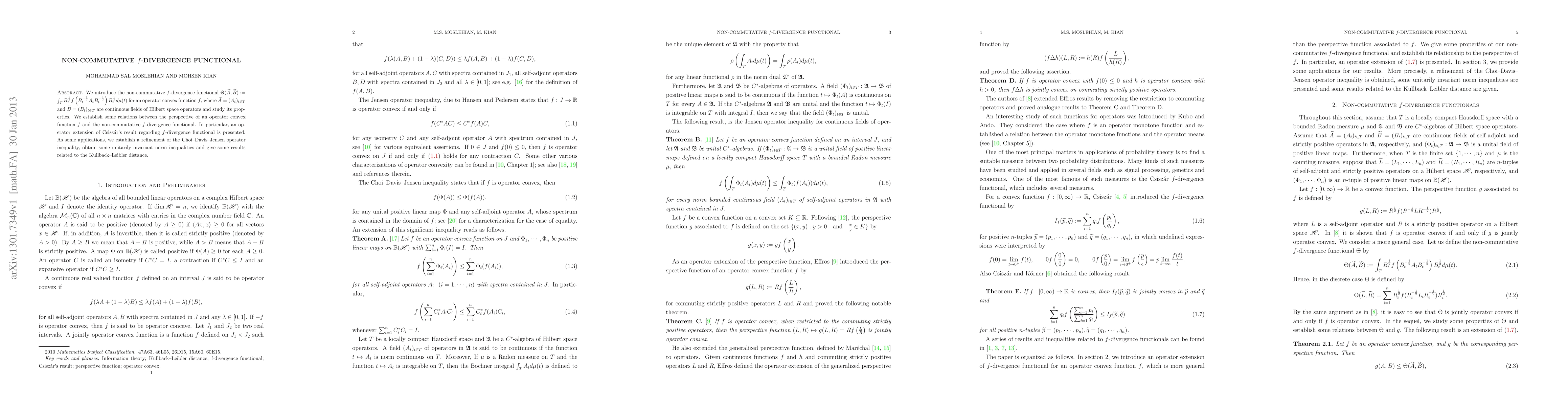 We introduce the non-commutative $f$-divergence functional $\Theta(\widetilde{A},\widetilde{B}):=\int_TB_t^{\frac{1}{2}}f\left(B_t^{-\frac{1}{2}} A_tB_t^{-\frac{1}{2}}\right)B_t^{\frac{1}{2}}d\mu(t)$ for an operator convex function $f$, where $\widetilde{A}=(A_t)_{t\in T}$ and $\widetilde{B}=(B_t)_{t\in T}$ are continuous fields of Hilbert space operators and study its properties. We establish some relations between the perspective of an operator convex function $f$ and the non-commutative $f$-divergence functional. In particular, an operator extension of Csisz\'{a}r's result regarding $f$-divergence functional is presented. As some applications, we establish a refinement of the Choi--Davis--Jensen operator inequality, obtain some unitarily invariant norm inequalities and give some results related to the Kullback--Leibler distance.