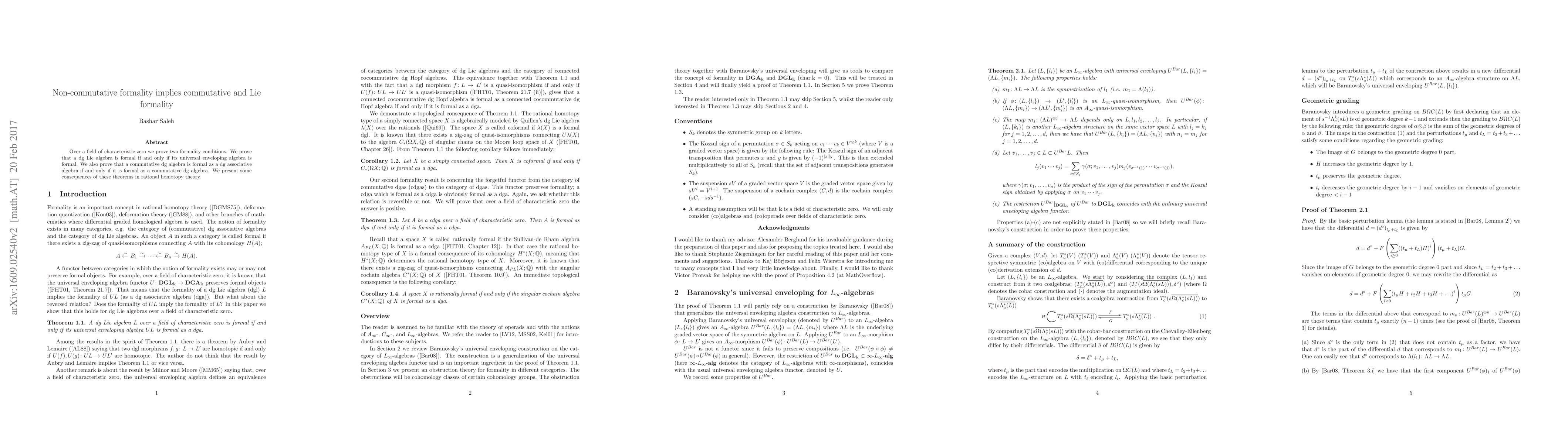 The paper proves that a dg Lie algebra's formality is equivalent to its universal enveloping algebra's formality over a characteristic zero field. It also establishes that a commutative dg algebra's formality as an associative algebra mirrors its formality as a commutative dg algebra. These findings have implications in rational homotopy theory.