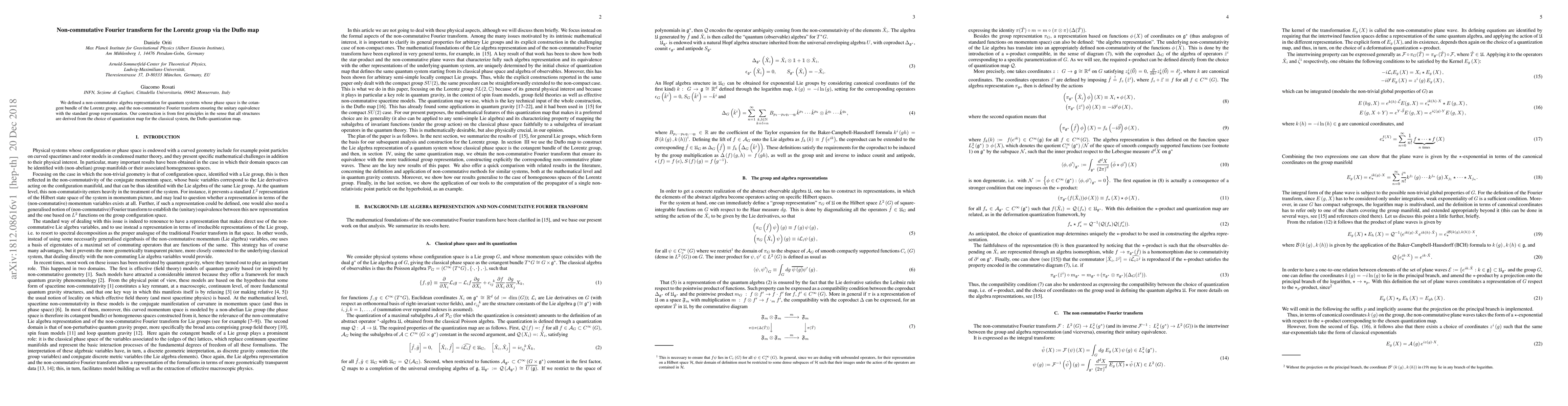 This paper introduces a non-commutative Fourier transform for quantum systems on the Lorentz group's cotangent bundle, ensuring unitary equivalence with the standard group representation. The construction leverages the Duflo quantization map to derive all necessary structures from first principles.