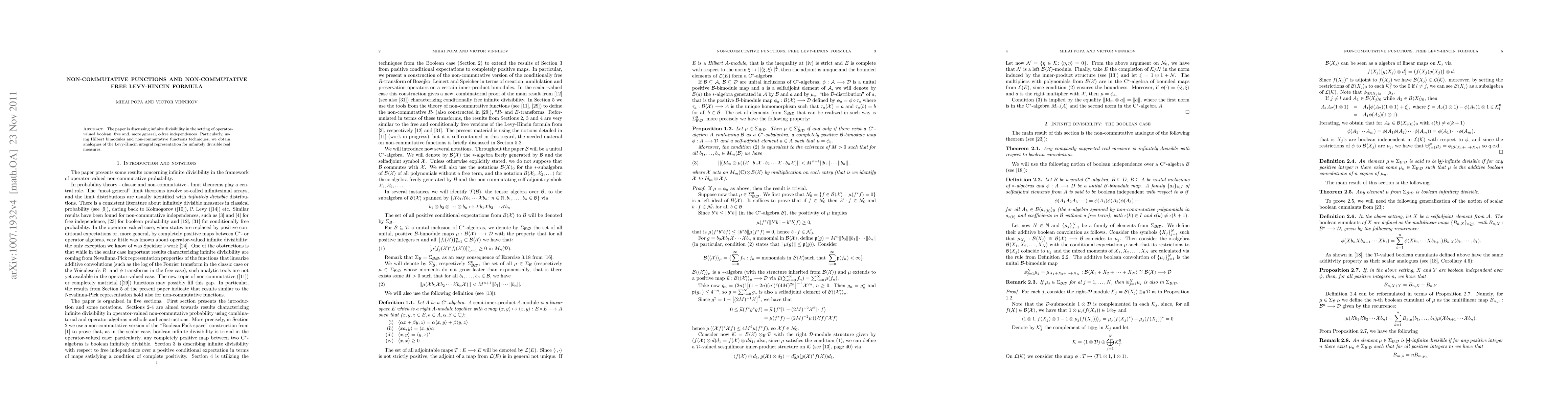 The paper is discussing infinite divisibility in the setting of operator-valued boolean, free and, more general, c-free independences. Particularly, using Hilbert bimodules and non-commutative functions techniques, we obtain analogues of the Levy-Hincin integral representation for infinitely divisible real measures.