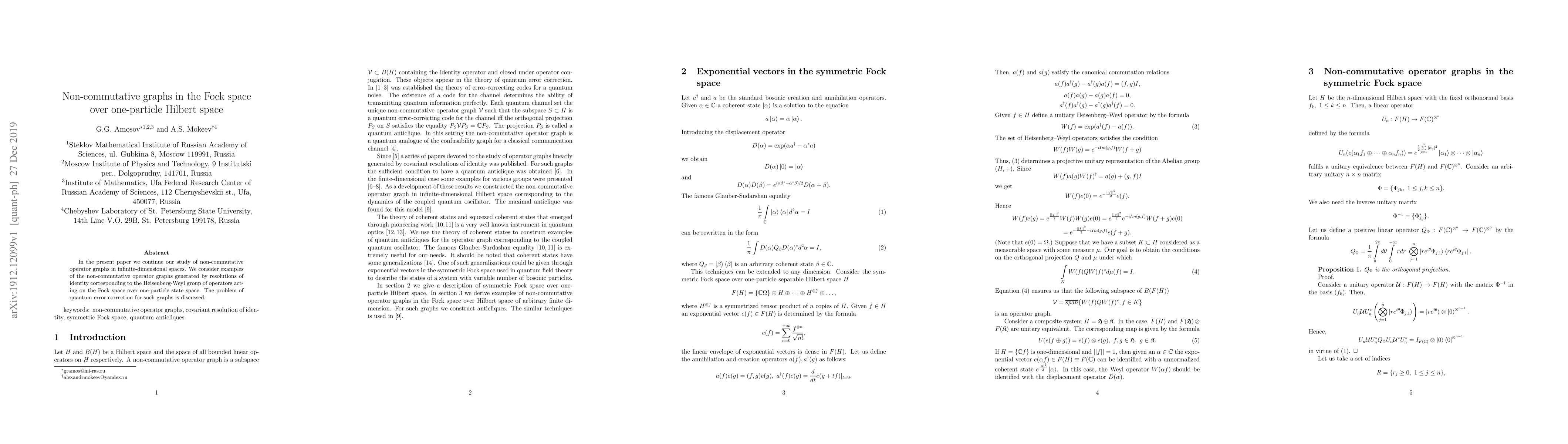 This paper explores non-commutative operator graphs within the Fock space, focusing on those generated by resolutions of identity tied to the Heisenberg-Weyl group, and examines the implications for quantum error correction in these infinite-dimensional settings.