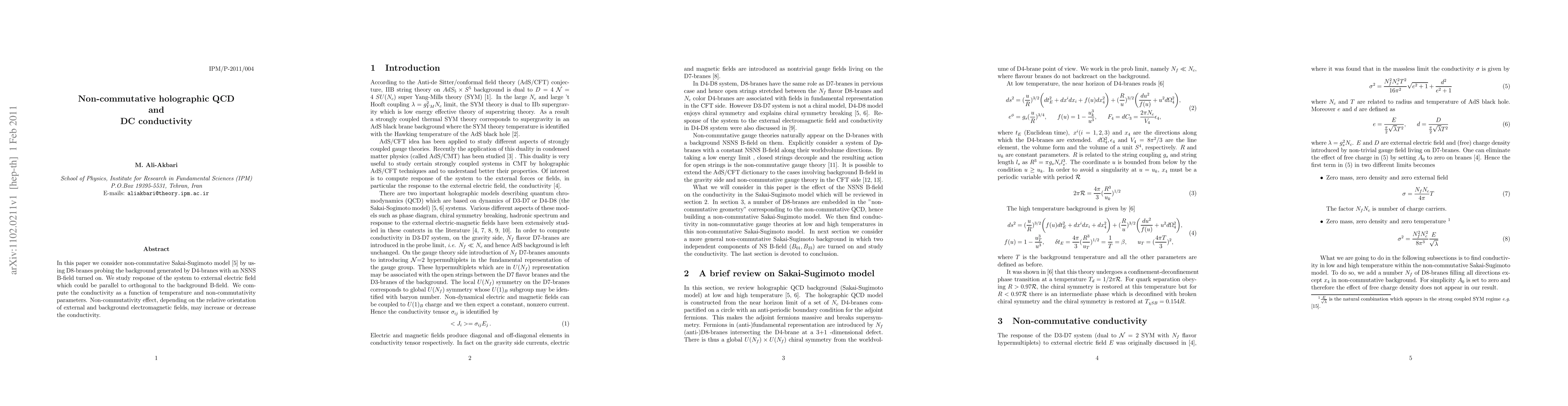 In this paper we consider non-commutative Sakai-Sugimoto model by using D8-branes probing the background generated by D4-branes with an NSNS B-field turned on. We study response of the system to external electric field which could be parallel to orthogonal to the background B-field. We compute the conductivity as a function of temperature and non-commutativity parameters. Non-commutativity effect, depending on the relative orientation of external and background electromagnetic fields, may increase or decrease the conductivity.
