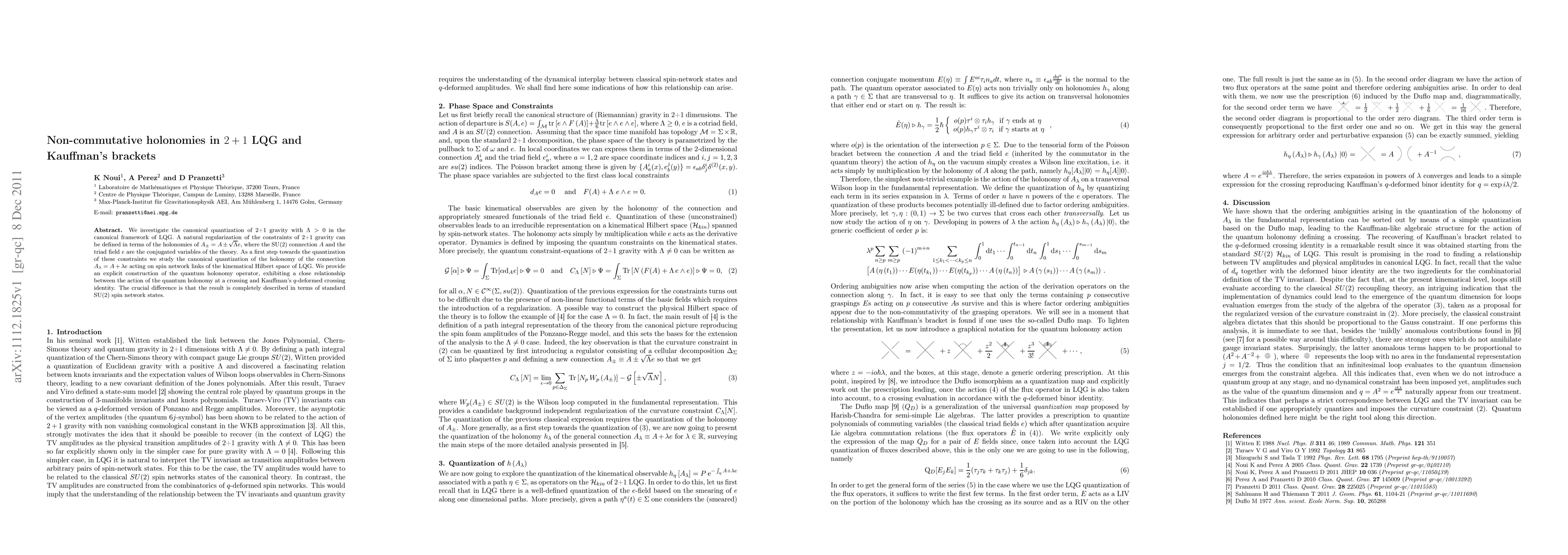 We investigate the canonical quantization of 2+1 gravity with {\Lambda} > 0 in the canonical framework of LQG. A natural regularization of the constraints of 2+1 gravity can be defined in terms of the holonomies of A\pm = A \PM \surd{\Lambda}e, where the SU(2) connection A and the triad field e are the conjugated variables of the theory. As a first step towards the quantization of these constraints we study the canonical quantization of the holonomy of the connection A_{\lambda} = A + {\lambda}e acting on spin network links of the kinematical Hilbert space of LQG. We provide an explicit construction of the quantum holonomy operator, exhibiting a close relationship between the action of the quantum holonomy at a crossing and Kauffman's q-deformed crossing identity. The crucial difference is that the result is completely described in terms of standard SU(2) spin network states.