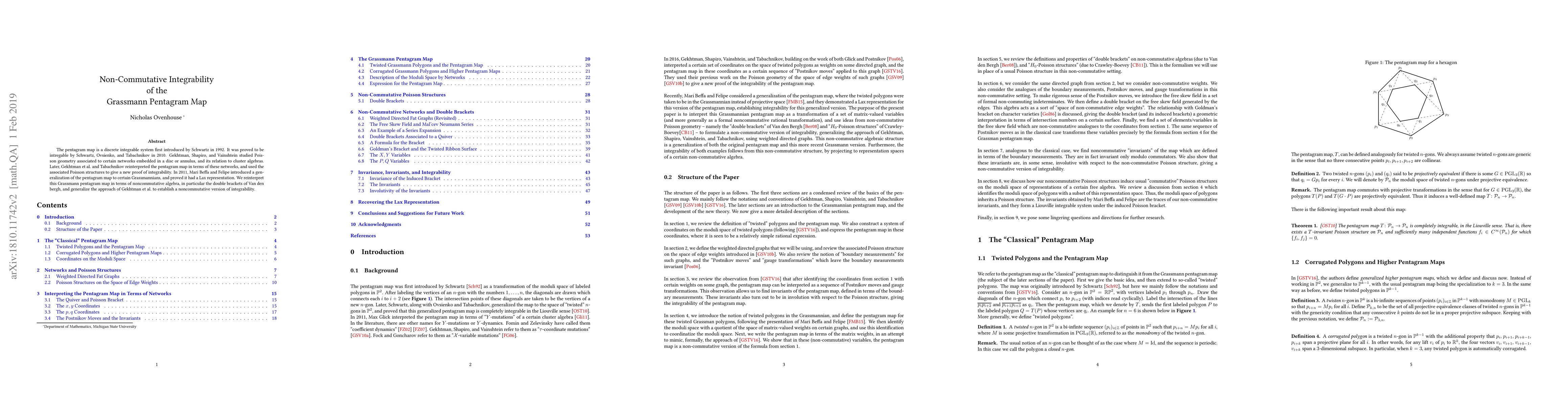 The pentagram map is a discrete integrable system first introduced by Schwartz in 1992. It was proved to be intregable by Schwartz, Ovsienko, and Tabachnikov in 2010. Gekhtman, Shapiro, and Vainshtein studied Poisson geometry associated to certain networks embedded in a disc or annulus, and its relation to cluster algebras. Later, Gekhtman et al. and Tabachnikov reinterpreted the pentagram map in terms of these networks, and used the associated Poisson structures to give a new proof of integrability. In 2011, Mari Beffa and Felipe introduced a generalization of the pentagram map to certain Grassmannians, and proved it was integrable. We reinterpret this Grassmann pentagram map in terms of noncommutative algebra, in particular the double brackets of Van den bergh, and generalize the approach of Gekhtman et al. to establish a noncommutative version of integrability.