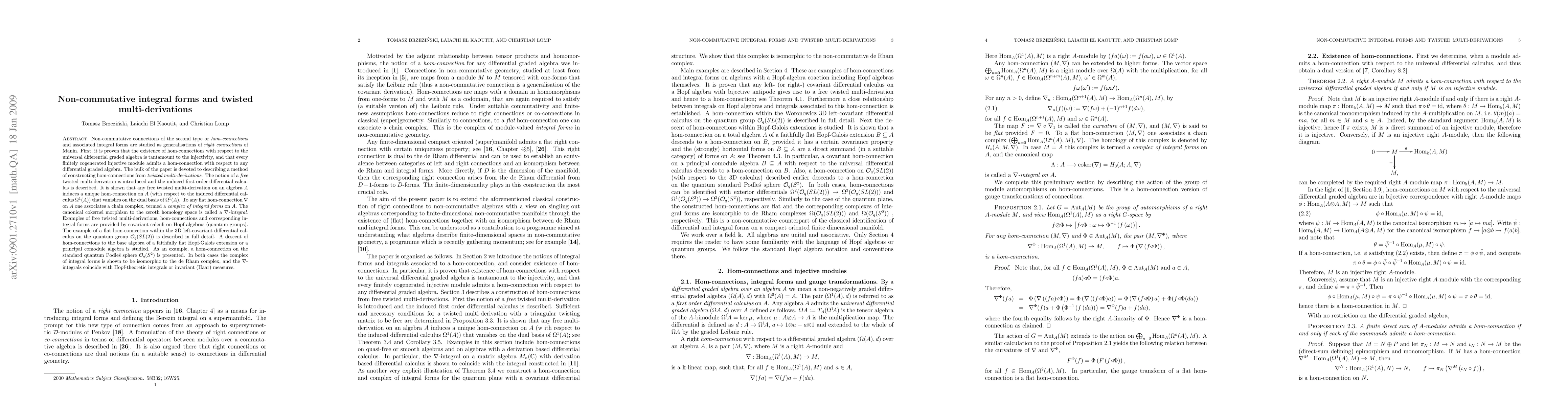 This paper explores non-commutative connections, specifically hom-connections, and their integral forms, proving their existence and injectivity. It introduces twisted multi-derivations to construct hom-connections and describes the associated complex of integral forms, linking them to Hopf algebras and quantum groups, and demonstrating their descent to base algebras.