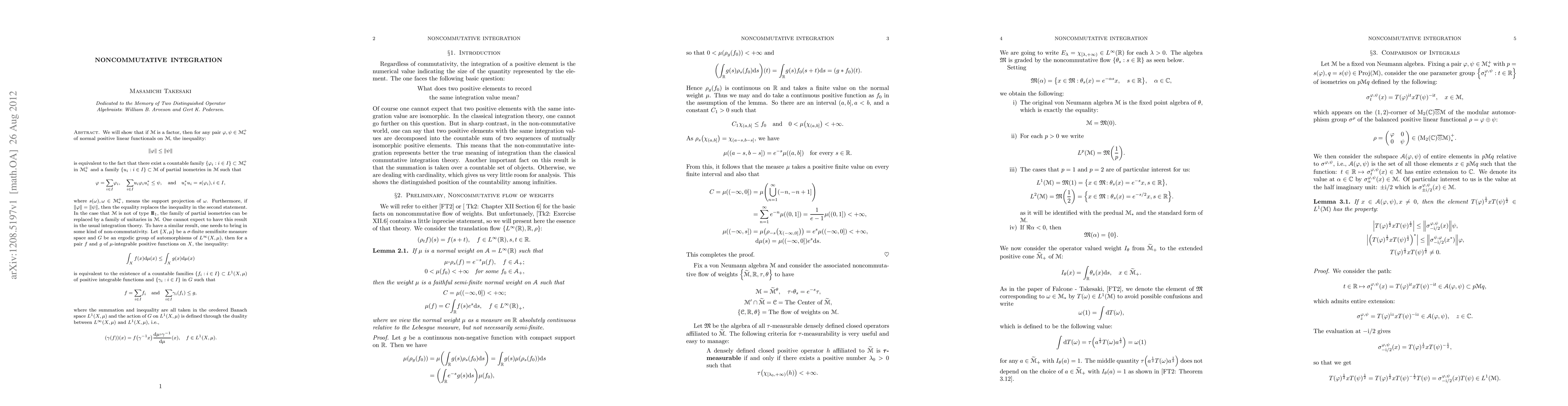 We will show that if $\sM$ is a factor, then for any pair $\f, \p\in\sMdsup$ of normal positive linear functionals on $\sM$, the inequality: $$ \lrnorm{\f}\leq \lrnorm{\p} $$ is equivalent to the fact that there exist a countable family $\lrbrace{\ffdi: i\in I}\subset \sMdsup$ in $\sMdsup$ and a family $\lrbrace{\udi: i\in I}\i\sM$ of partial isometries in \cM such that $$ \f=\sumd{i\in I} \ffdi,\quad \sumd{i\in I} \udi{\ffdi}\udius\leq \p, \quad \text{and} \quad \udius\udi=s\lr{\ffdi}, i\in I, $$ where $s(\omega), \omega\in\sMdsup$, means the support projection of $\omega$. Furthermore, if $\lrnorm{\f}=\lrnorm{\p}$, then the equality replaces the inequality in the second statement. In the case that $\sM$ is not of type \threeonec the family of partial isometries can be replaced by a family of unitaries in \cMp One cannot expect to have this result in the usual integration thoery. To have a similar result, one needs to bring in some kind of non-commutativity. Let $\lrbrace{X, \mu}$ be a $\sig$-finite semifinite measure space and $G$ be an ergodic group of automorphisms of $\linflr{X, \mu}$, then for a pair $f$ and $g$ of $\mu$-integrable positive functions on $X$, the inequality: $$ \int_X f(x)\txd \mu(x)\leq \int_X g(x)\txd \mu(x) $$ is equivalent to the existence of a countable families $\lrbrace{\fdi: i\in I}\subset L^1(X, \mu)$ of positive integrable functions and $\lrbrace{\gdi: i\in I}$ in $G$ such that $$ f=\sumd{i\in I} \fdi\quad\text{and}\quad \sumd{i\in I} \gdi\lr{\fdi}\leq g, $$ where the summation and inequality are all taken in the oredered Banach space $L^1(X, \mu)$ and the action of $G$ on $\lonelr{X, \mu}$ is defined through the duality between $\linflr{X, \mu}$ and $\lonelr{X, \mu}$, i.e., \lr{\g(f)}(x)&=f\lr{\g\inv x}\frac{\txd\mu\scirc \g\inv}{\txd\mu}(x), \quad f\in\lonelr{X, \mu}.