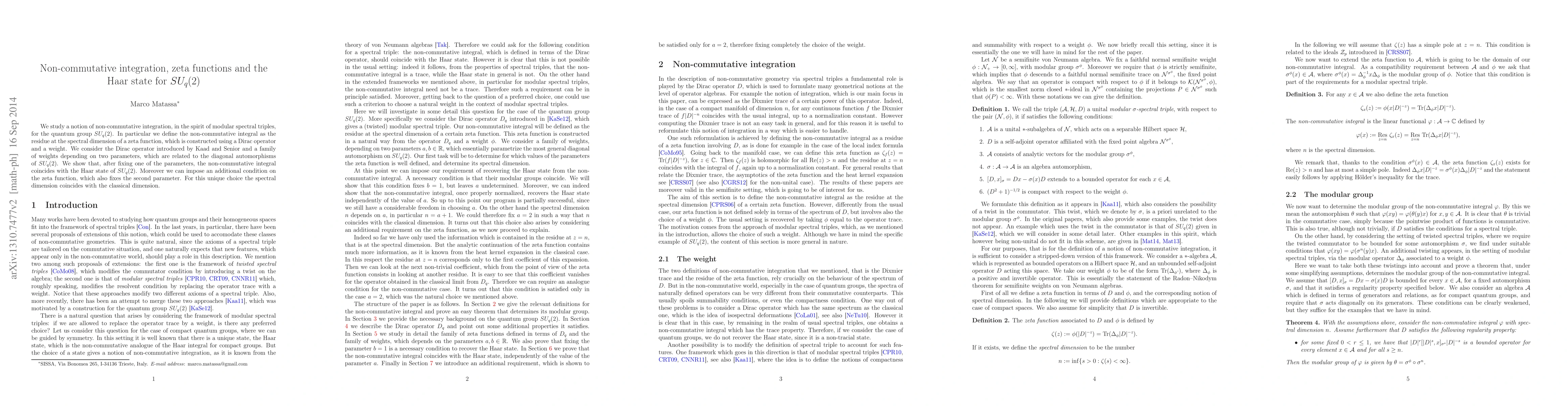 We study a notion of non-commutative integration, in the spirit of modular spectral triples, for the quantum group $SU_{q}(2)$. In particular we define the non-commutative integral as the residue at the spectral dimension of a zeta function, which is constructed using a Dirac operator and a weight. We consider the Dirac operator introduced by Kaad and Senior and a family of weights depending on two parameters, which are related to the diagonal automorphisms of $SU_{q}(2)$. We show that, after fixing one of the parameters, the non-commutative integral coincides with the Haar state of $SU_{q}(2)$. Moreover we can impose an additional condition on the zeta function, which also fixes the second parameter. For this unique choice the spectral dimension coincides with the classical dimension.