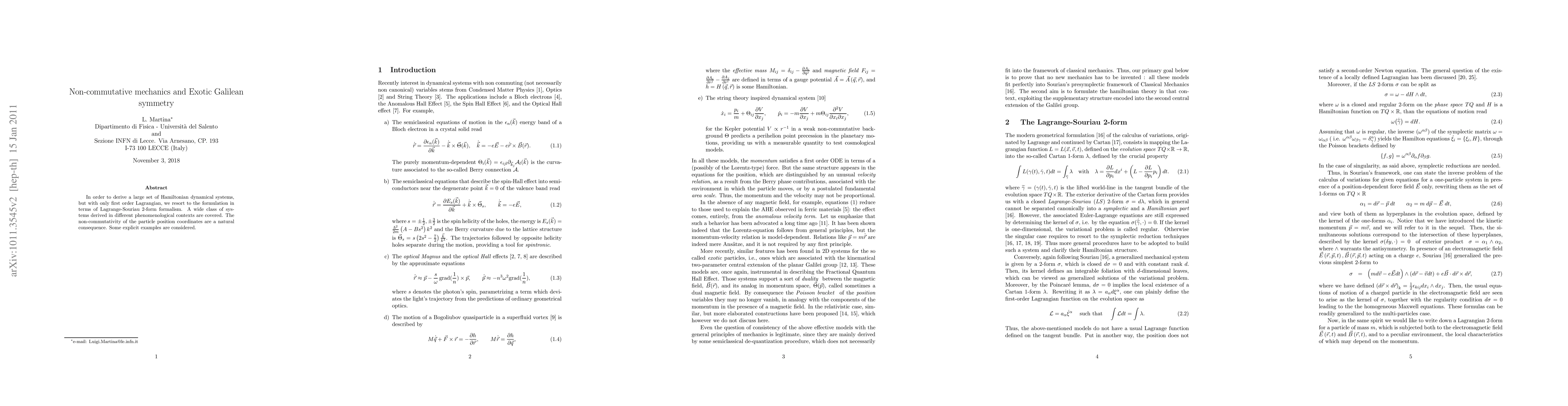 In order to derive a large set of Hamiltonian dynamical systems, but with only first order Lagrangian, we resort to the formulation in terms of Lagrange-Souriau 2-form formalism. A wide class of systems derived in different phenomenological contexts are covered. The non-commutativity of the particle position coordinates are a natural consequence. Some explicit examples are considered.