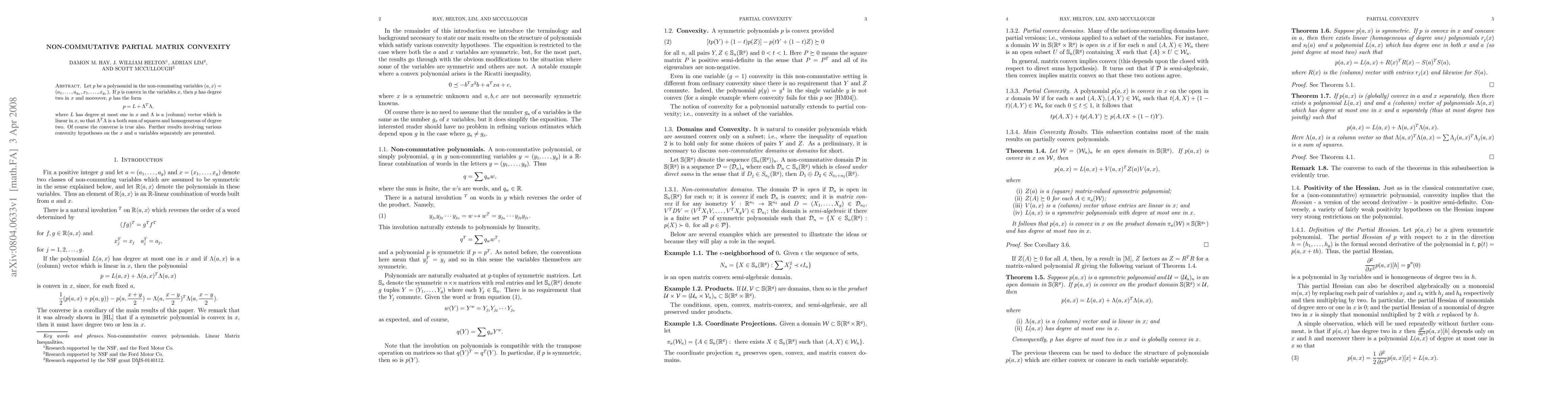 Let $p$ be a polynomial in the non-commuting variables $(a,x)=(a_1,...,a_{g_a},x_1,...,x_{g_x})$. If $p$ is convex in the variables $x$, then $p$ has degree two in $x$ and moreover, $p$ has the form $p = L + \Lambda ^T \Lambda,$ where $L$ has degree at most one in $x$ and $\Lambda$ is a (column) vector which is linear in $x,$ so that $\Lambda^T\Lambda$ is a both sum of squares and homogeneous of degree two. Of course the converse is true also. Further results involving various convexity hypotheses on the $x$ and $a$ variables separately are presented.