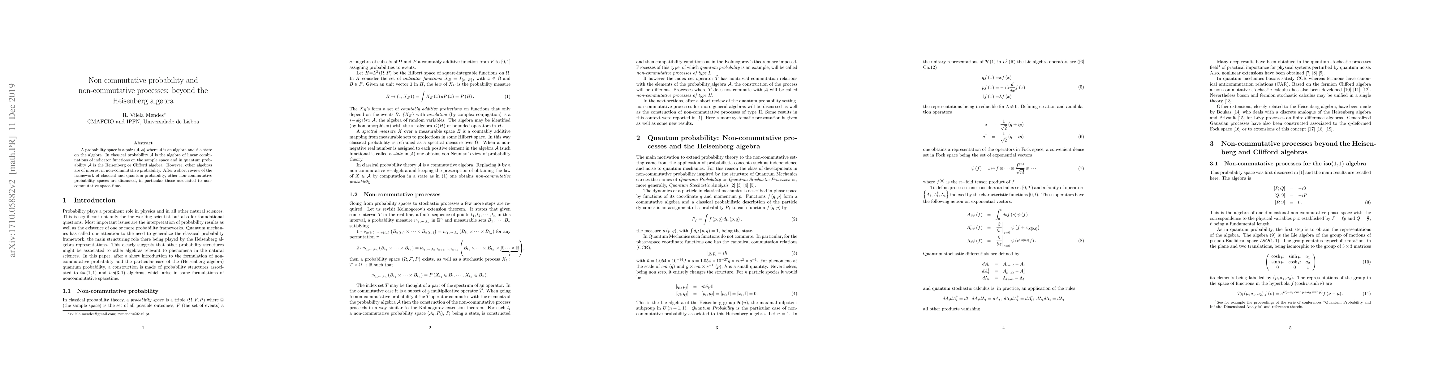 This paper explores non-commutative probability spaces, defining them as pairs ($\mathcal{A}, \phi$) where $\mathcal{A}$ is an algebra and $\phi$ is a state on the algebra. It contrasts classical and quantum probability spaces and highlights the significance of non-commutative algebras in understanding non-commutative processes, particularly in the context of non-commutative space-time.