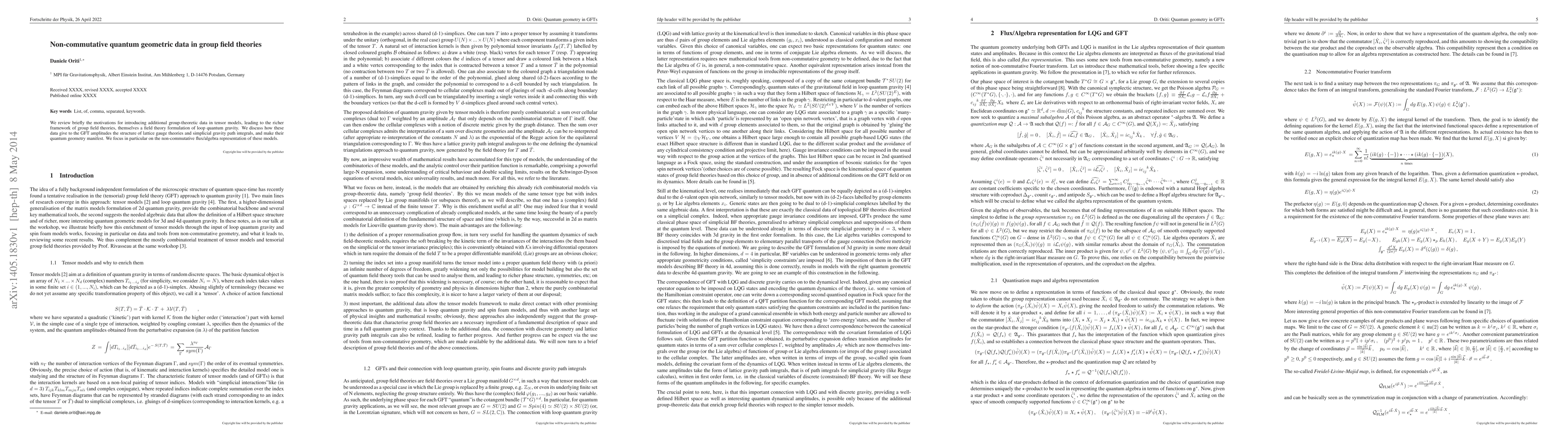 This paper reviews the integration of group-theoretic data into tensor models, forming group field theories (GFTs) that represent loop quantum gravity. It highlights how GFTs exhibit the structure of lattice gauge theories and simplicial gravity, emphasizing the non-commutative flux/algebra representation of these quantum geometric frameworks.