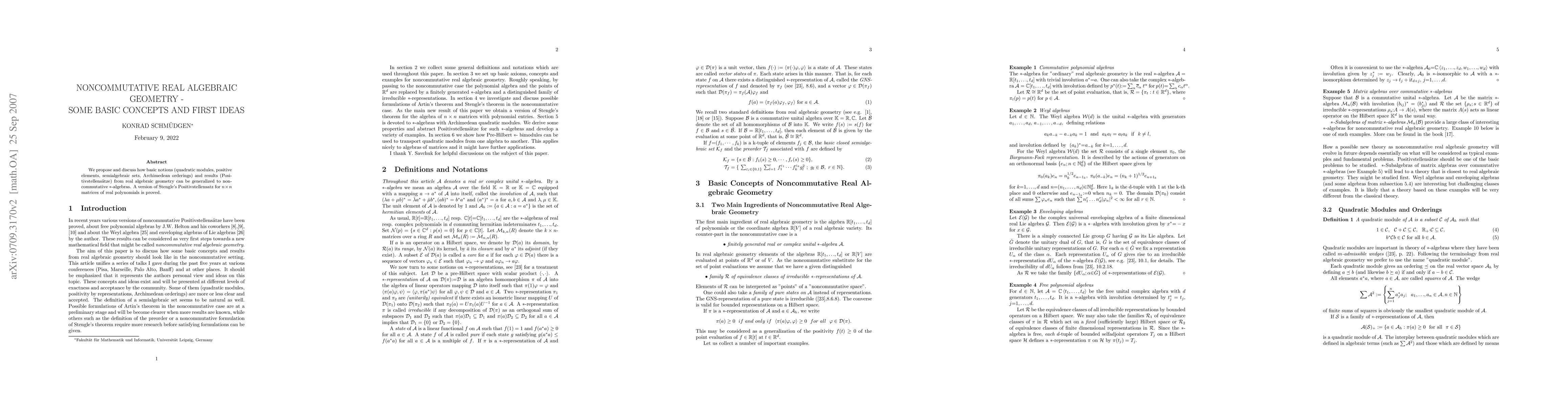 We propose and discuss how basic notions (quadratic modules, positive elements, semialgebraic sets, Archimedean orderings) and results (Positivstellensaetze) from real algebraic geometry can be generalized to noncommutative $*$-algebras. A version of Stengle's Positivstellensatz for $n \times n$ matrices of real polynomials is proved.