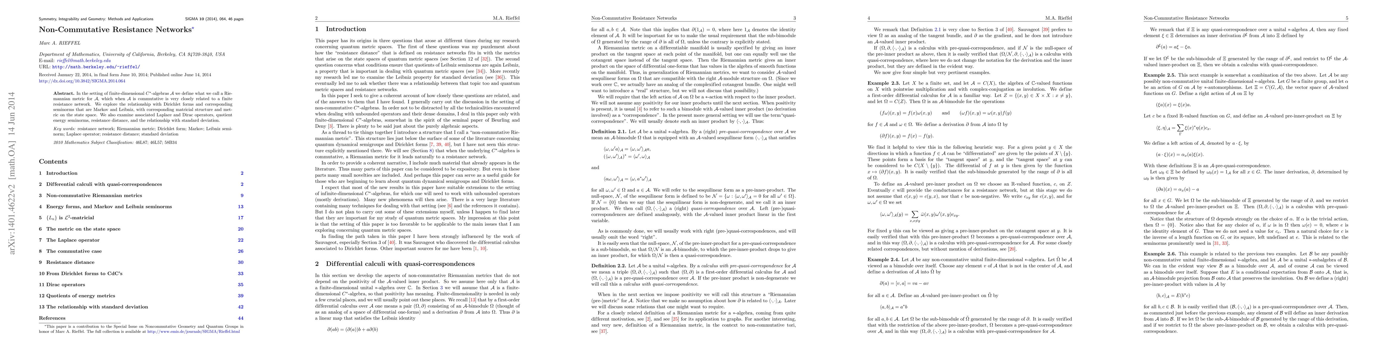 In the setting of finite-dimensional $C^*$-algebras ${\mathcal A}$ we define what we call a Riemannian metric for ${\mathcal A}$, which when ${\mathcal A}$ is commutative is very closely related to a finite resistance network. We explore the relationship with Dirichlet forms and corresponding seminorms that are Markov and Leibniz, with corresponding matricial structure and metric on the state space. We also examine associated Laplace and Dirac operators, quotient energy seminorms, resistance distance, and the relationship with standard deviation.