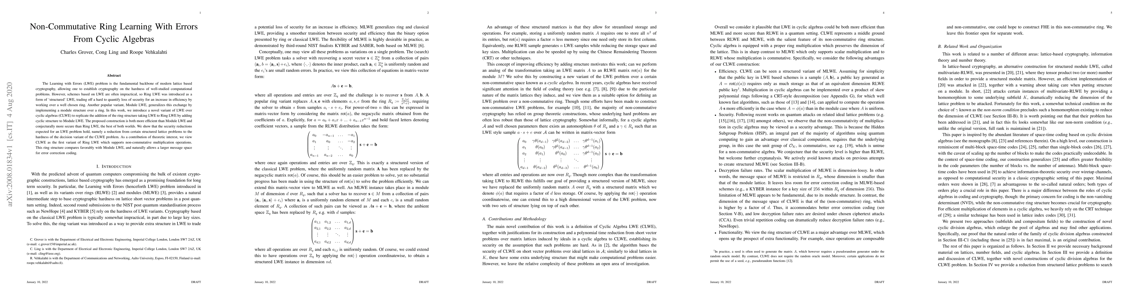 The Learning with Errors (LWE) problem is the fundamental backbone of modern lattice based cryptography, allowing one to establish cryptography on the hardness of well-studied computational problems. However, schemes based on LWE are often impractical, so Ring LWE was introduced as a form of `structured' LWE, trading off a hard to quantify loss of security for an increase in efficiency by working over a well chosen ring. Another popular variant, Module LWE, generalizes this exchange by implementing a module structure over a ring. In this work, we introduce a novel variant of LWE over cyclic algebras (CLWE) to replicate the addition of the ring structure taking LWE to Ring LWE by adding cyclic structure to Module LWE. The proposed construction is both more efficient than Module LWE and conjecturally more secure than Ring LWE, the best of both worlds. We show that the security reductions expected for an LWE problem hold, namely a reduction from certain structured lattice problems to the hardness of the decision variant of the CLWE problem. As a contribution of theoretic interest, we view CLWE as the first variant of Ring LWE which supports non-commutative multiplication operations. This ring structure compares favorably with Module LWE, and naturally allows a larger message space for error correction coding.