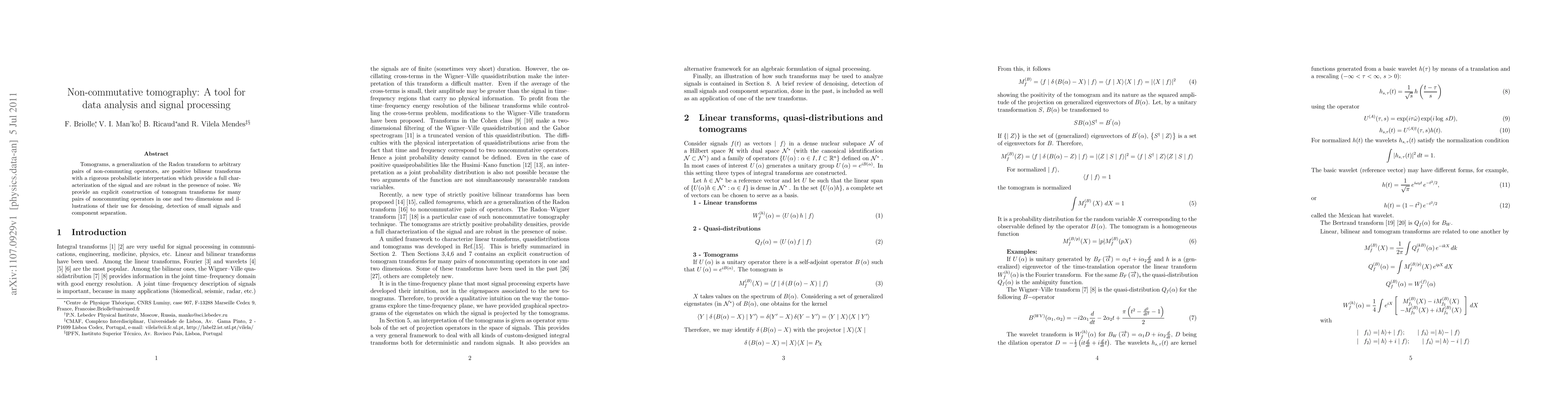 Tomograms, a generalization of the Radon transform to arbitrary pairs of non-commuting operators, are positive bilinear transforms with a rigorous probabilistic interpretation which provide a full characterization of the signal and are robust in the presence of noise. We provide an explicit construction of tomogram transforms for many pairs of noncommuting operators in one and two dimensions and illustrations of their use for denoising, detection of small signals and component separation.