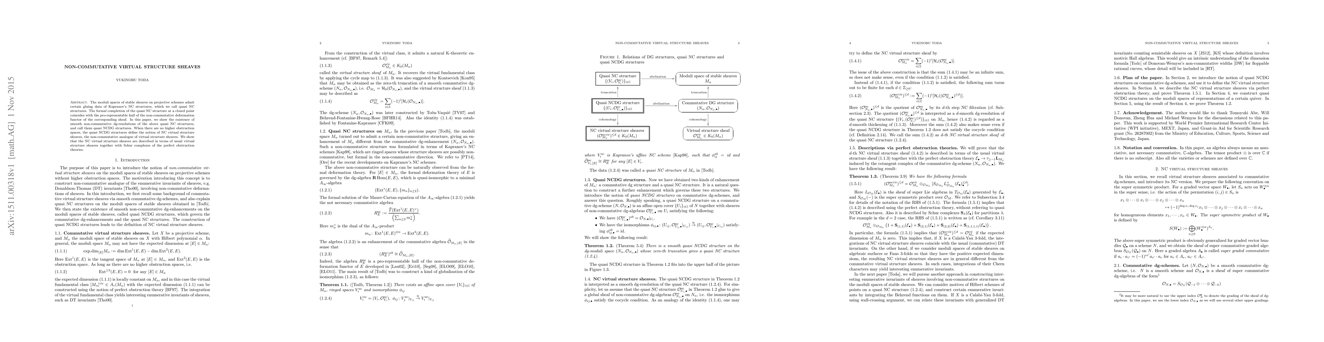 This paper investigates quasi NC structures on moduli spaces of stable sheaves, showing their equivalence to non-commutative deformation functors. It introduces quasi NCDG structures as smooth non-commutative dg-resolutions and defines NC virtual structure sheaves, analogous to virtual structure sheaves, using Schur complexes of perfect obstruction theories.