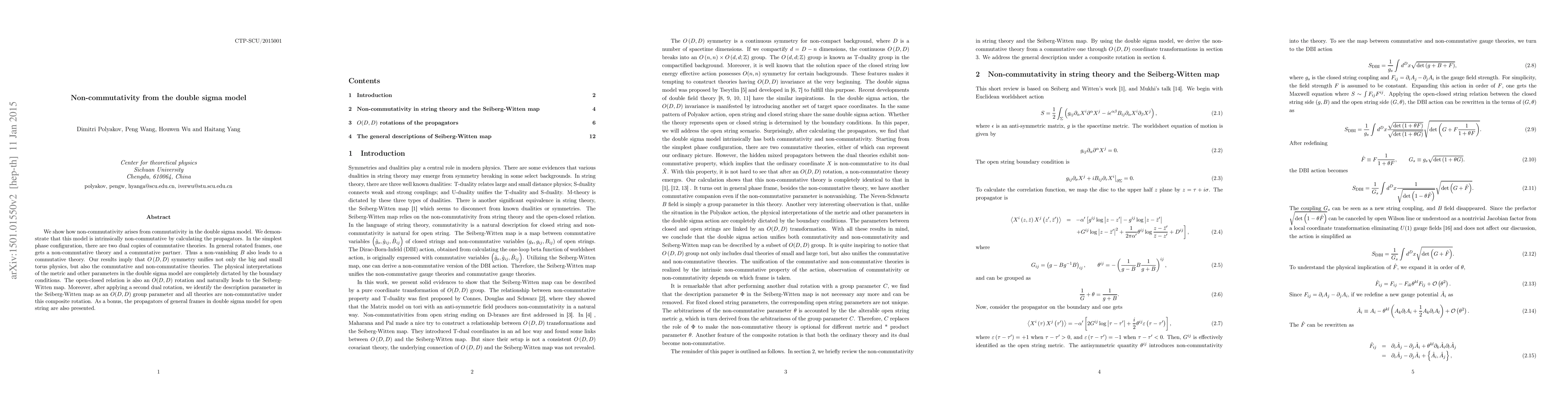 We show how non-commutativity arises from commutativity in the double sigma model. We demonstrate that this model is intrinsically non-commutative by calculating the propagators. In the simplest phase configuration, there are two dual copies of commutative theories. In general rotated frames, one gets a non-commutative theory and a commutative partner. Thus a non-vanishing $B$ also leads to a commutative theory. Our results imply that $O\left(D,D\right)$ symmetry unifies not only the big and small torus physics, but also the commutative and non-commutative theories. The physical interpretations of the metric and other parameters in the double sigma model are completely dictated by the boundary conditions. The open-closed relation is also an $O(D,D)$ rotation and naturally leads to the Seiberg-Witten map. Moreover, after applying a second dual rotation, we identify the description parameter in the Seiberg-Witten map as an $O(D,D)$ group parameter and all theories are non-commutative under this composite rotation. As a bonus, the propagators of general frames in double sigma model for open string are also presented.
