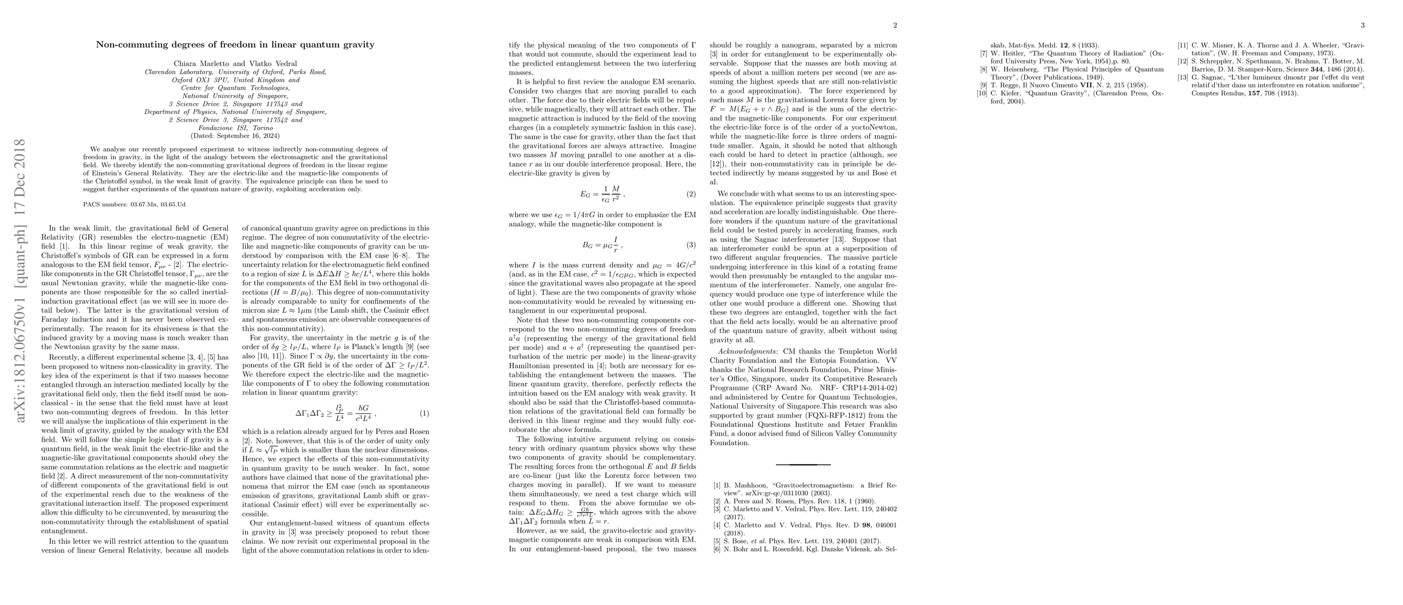 We analyse our recently proposed experiment to witness indirectly non-commuting degrees of freedom in gravity, in the light of the analogy between the electromagnetic and the gravitational field. We thereby identify the non-commuting gravitational degrees of freedom in the linear regime of Einstein's General Relativity. They are the electric-like and the magnetic-like components of the Christoffel symbol, in the weak limit of gravity. The equivalence principle can then be used to suggest further experiments of the quantum nature of gravity, exploiting acceleration only.