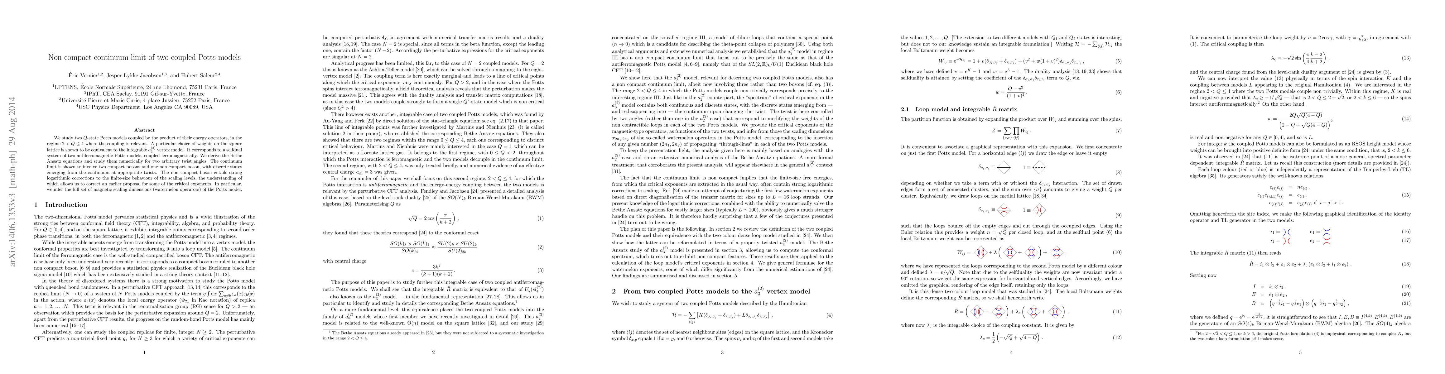 This paper investigates the continuum limit of two coupled $Q$-state Potts models, revealing a system equivalent to the integrable $a_3^{(2)}$ vertex model. It identifies non-compact bosons and strong logarithmic corrections affecting the finite-size scaling, leading to a corrected set of critical exponents and magnetic scaling dimensions.