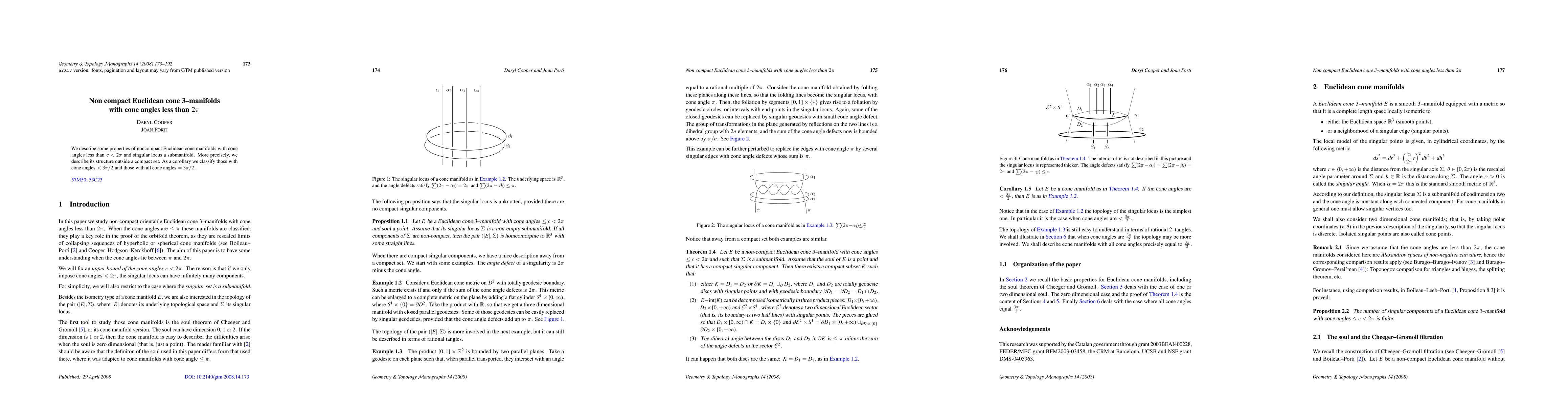 This paper explores the structural properties of noncompact Euclidean cone 3-manifolds with cone angles less than 2π, focusing on regions outside compact subsets. It classifies manifolds with cone angles less than 3π/2 and those with all cone angles equal to 3π/2.