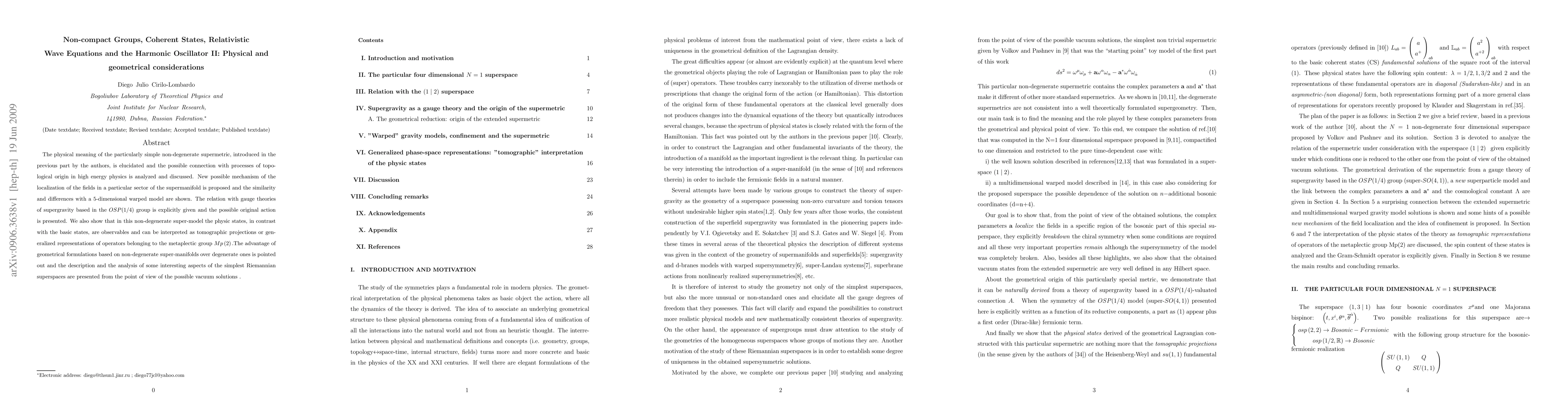 The physical meaning of the particularly simple non-degenerate supermetric, introduced in the previous part by the authors, is elucidated and the possible connection with processes of topological origin in high energy physics is analyzed and discussed. New possible mechanism of the localization of the fields in a particular sector of the supermanifold is proposed and the similarity and differences with a 5-dimensional warped model are shown. The relation with gauge theories of supergravity based in the $OSP(1/4)$ group is explicitly given and the possible original action is presented. We also show that in this non-degenerate super-model the physic states, in contrast with the basic states, are observables and can be interpreted as tomographic projections or generalized representations of operators belonging to the metaplectic group $Mp(2)$. The advantage of geometrical formulations based on non-degenerate super-manifolds over degenerate ones is pointed out and the description and the analysis of some interesting aspects of the simplest Riemannian superspaces are presented from the point of view of the possible vacuum solutions.